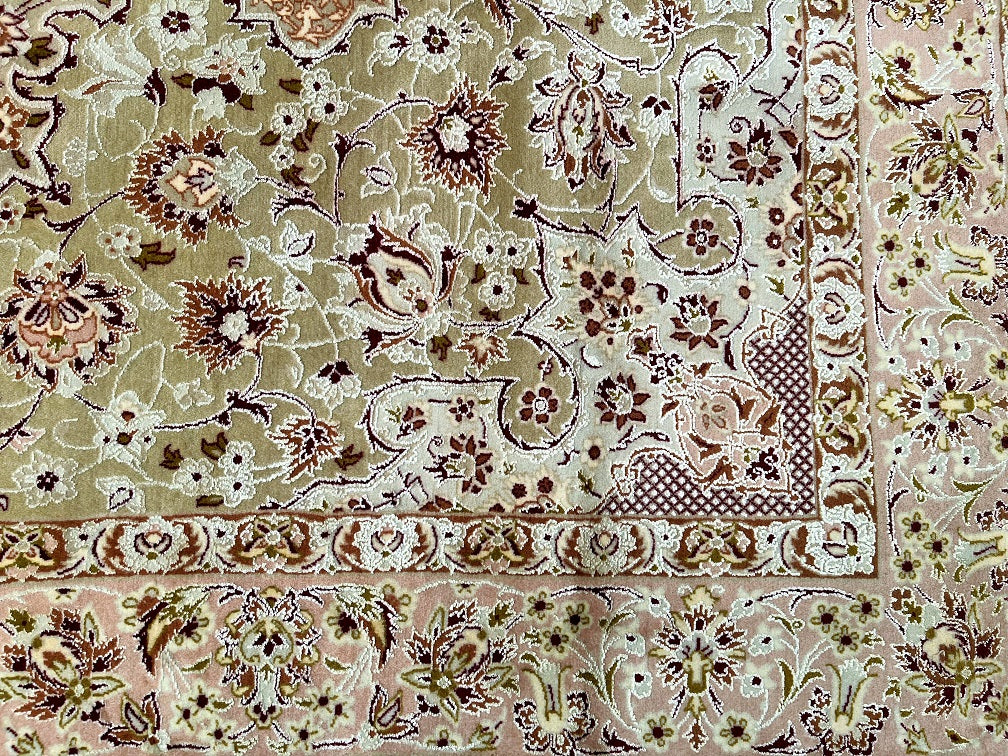 Masterpiece Authentic Handmade Persian Isfahan Rug. Above All lsfahan Carpets Are Highly Rated by Rug Traders and Lovers All around the World, Arguably the Jewel of Hand Woven Rugs. Wool and Silk Pile on Silk Foundation. It Also Has A Beige With Hint Of Green, Burgundy, Light Brown, Aqua And Pink Tones Dyed Using Traditional Methods.