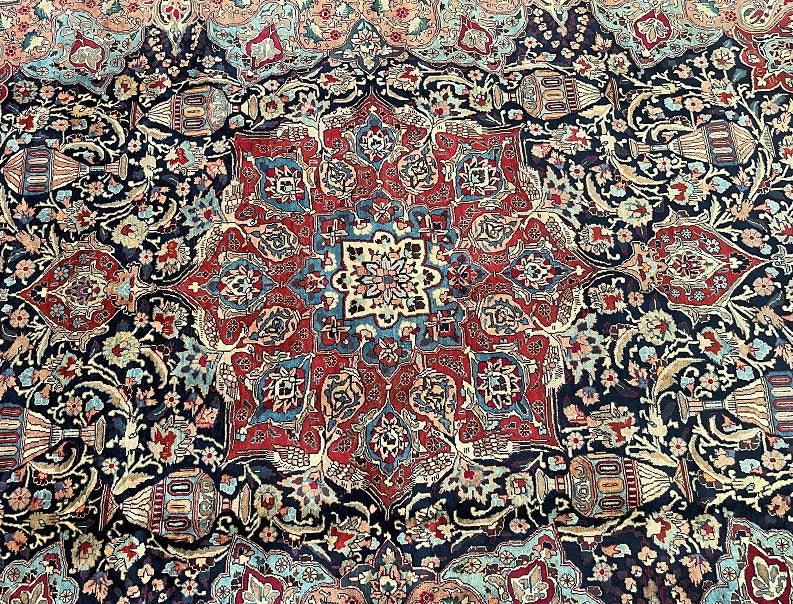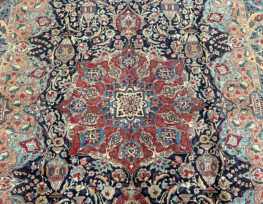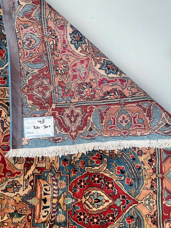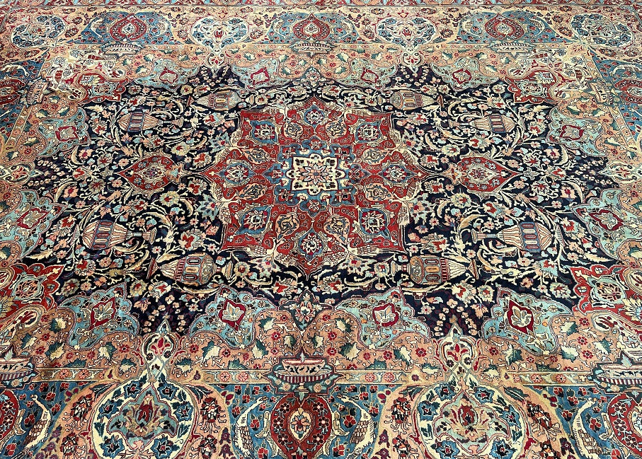 This vintage Persian Kashmar carpet is a remarkable piece, boasting a spacious size and meticulous craftsmanship using natural fibres. Its rarity and collectability make it highly sought after. The carpet features a luxurious lamb's wool pile on a durable cotton base, ensuring both comfort and longevity. The beautiful blue, brown, and beige colors are achieved through the use of organic dyes and traditional methods. The centrepiece of the carpet is a captivating central medallion treasure design, reminiscent of archaeological patterns. The intricate weaving process involved the dedicated work of two skilled weavers for approximately 12 months. Originating from the city of Kashmar in East Persia, this carpet measures 390 x 300 cm and holds a gallery replacement value of $12,900.