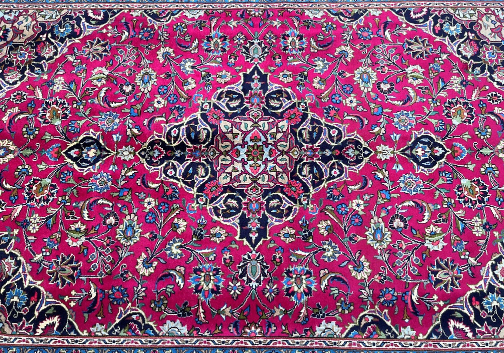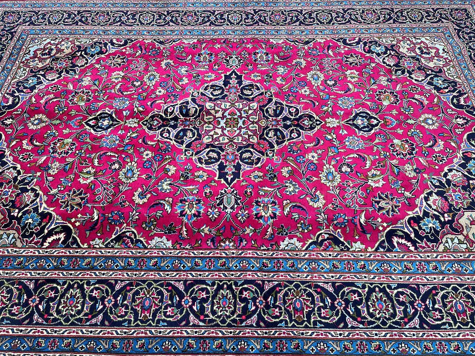 Full Room Size Authentic Handmade Persian Kashmar Rug. Above All It Is Hard To Get This Quality Original Handmade Rug At Such Low Price. Pure Lamb’s Wool Pile on Cotton Base. It Also Has A Magenta Red, Indigo Blue, Beige, Light Blue, Pink, Brown And Green Tone With Hint Of Burgundy Dyed Using Traditional Methods. Dense Quality Piece That Would Last For Many Years to Come/