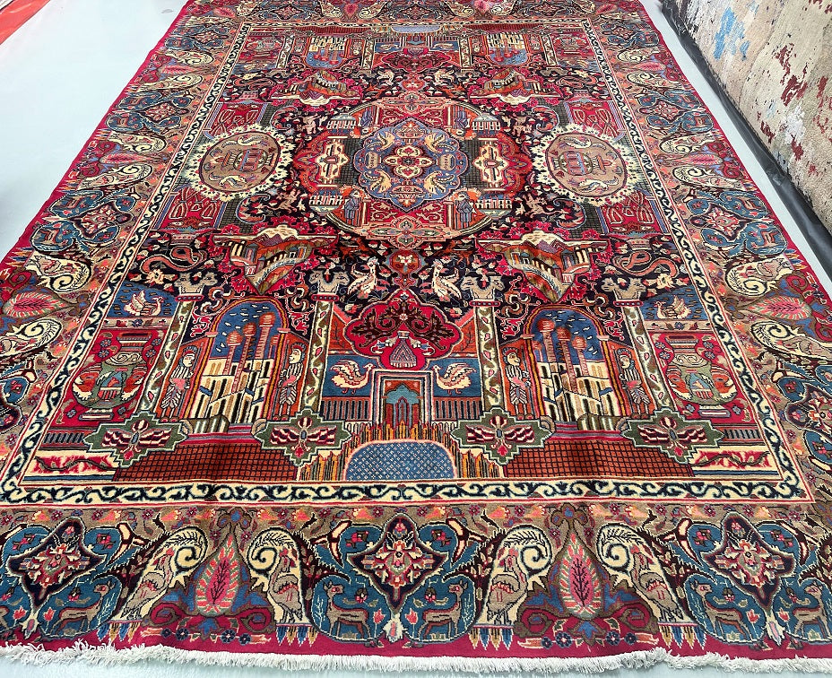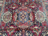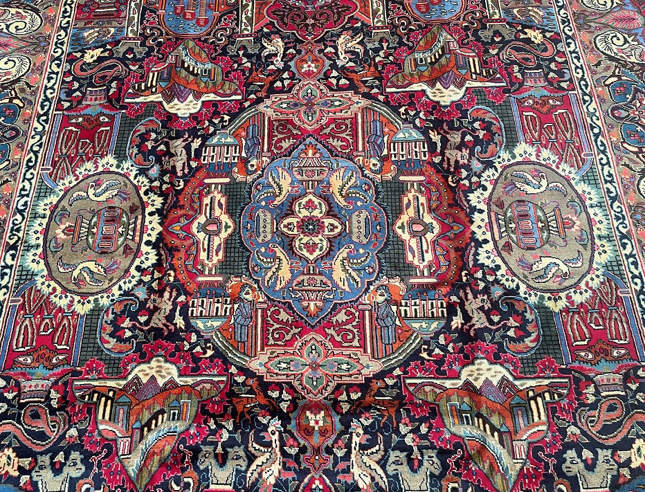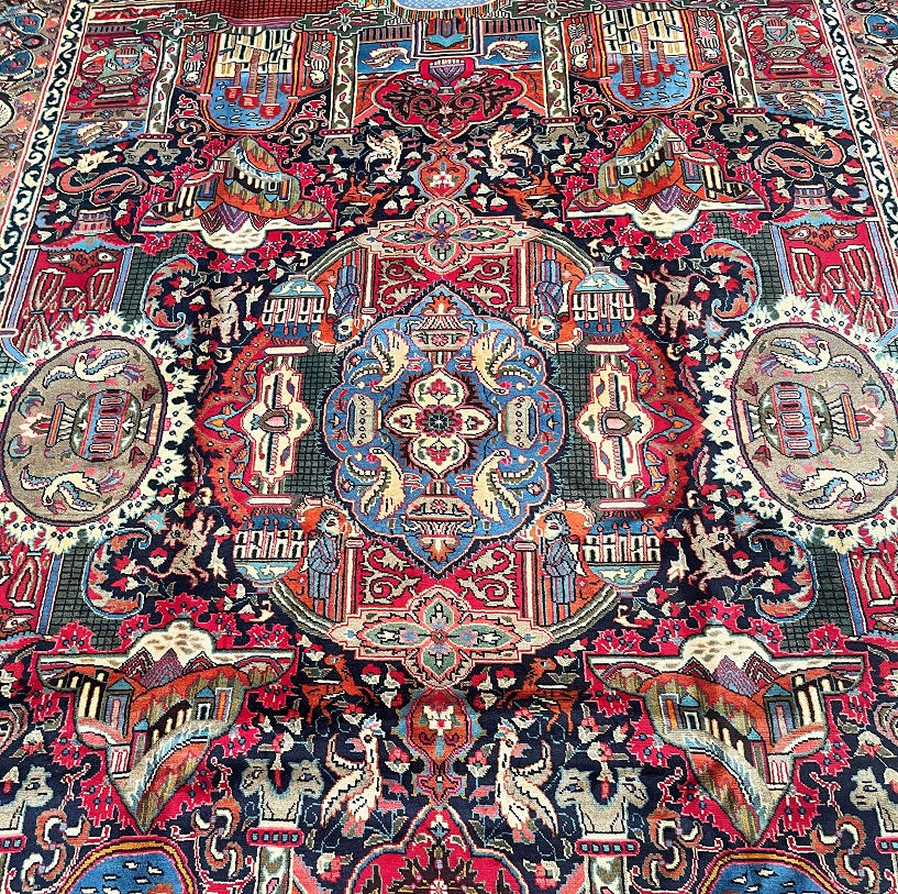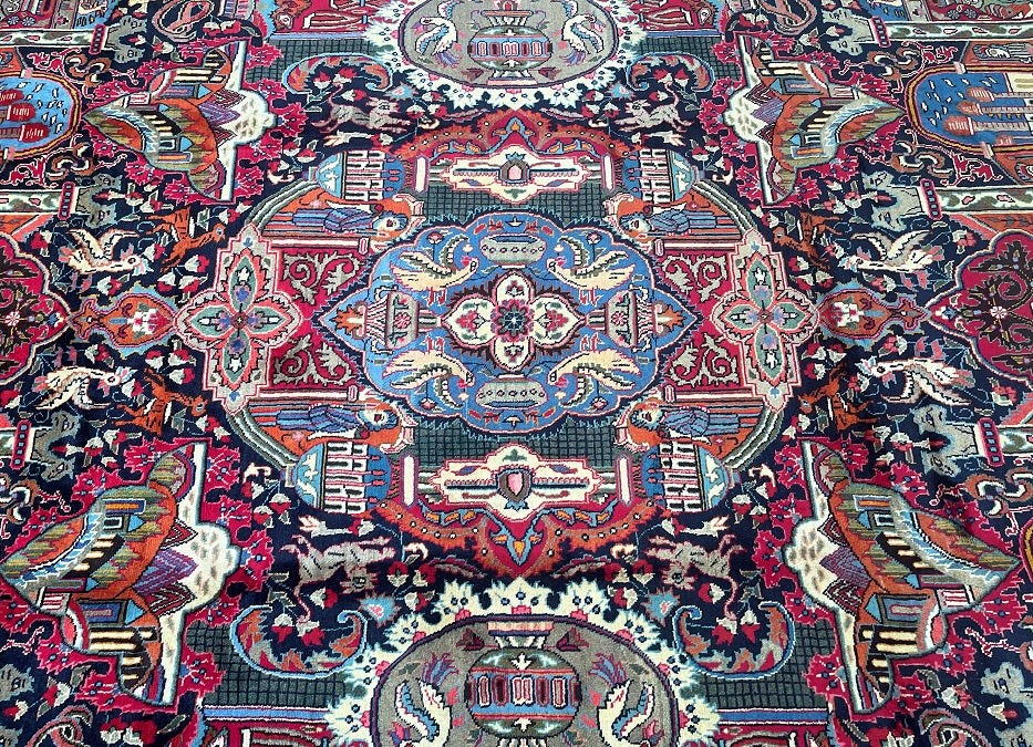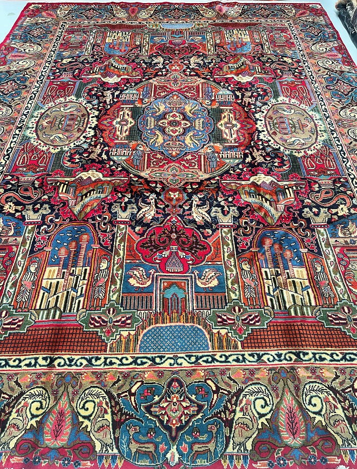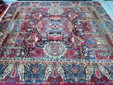 Large Room Size Authentic Hand Knotted Persepolis Persian Kashmar Carpet. Above All It Is Hard To Get Find Handmade Rug In Such Unique Pattern. Pure Lamb’s Wool Pile On Cotton Base. It Also Has A Multi-Color Tones Dyed Using Traditional Methods.