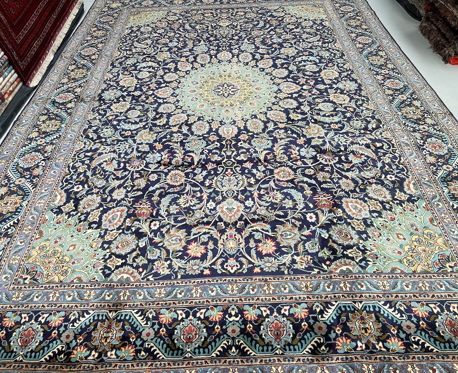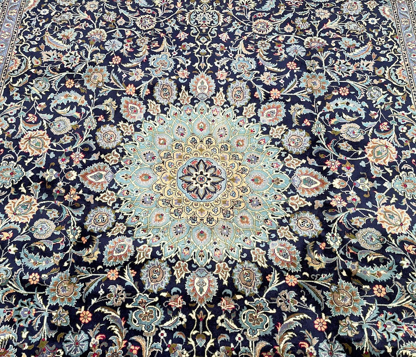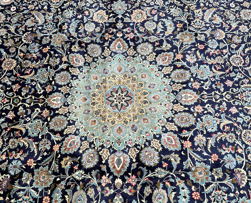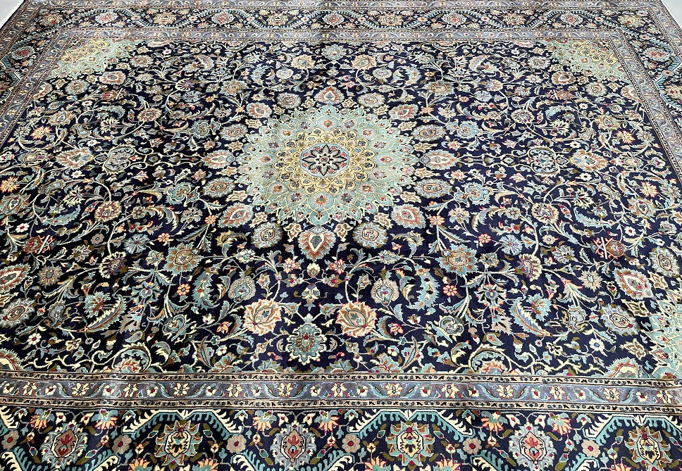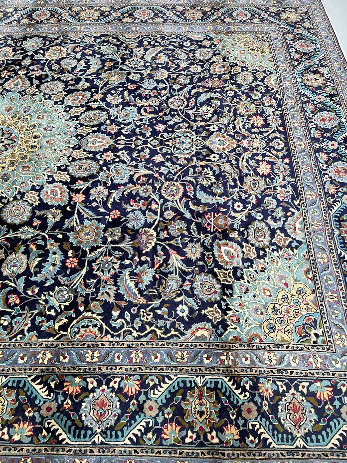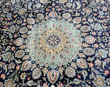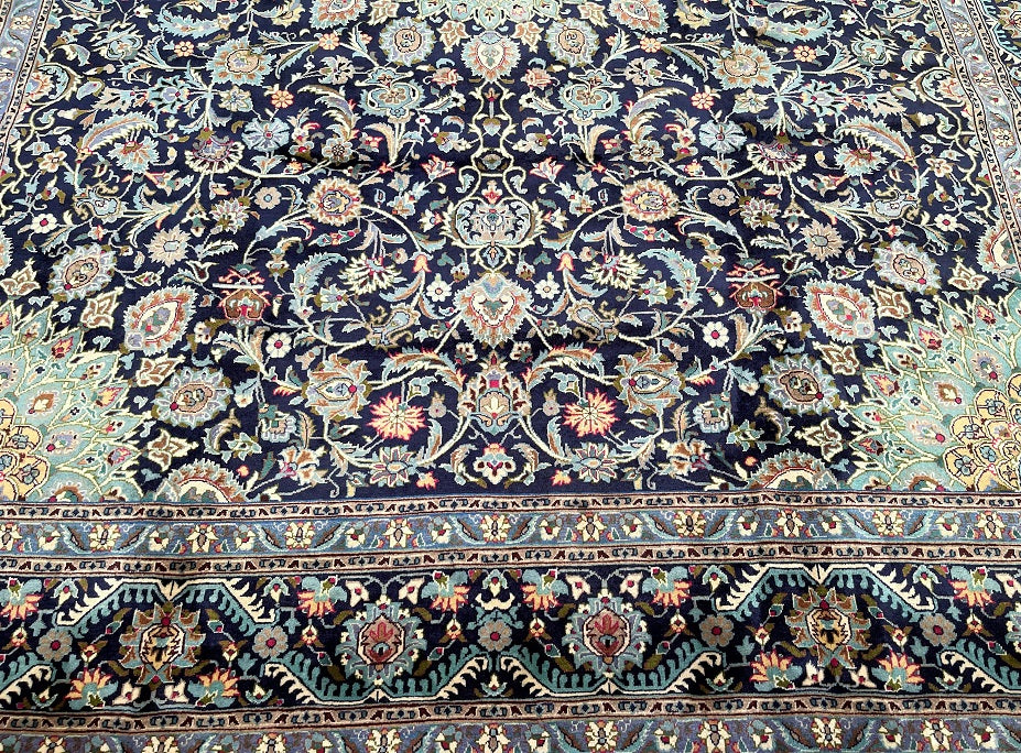 Large Room Size Authentic Handmade Persian Kashmar Rug. Above All It Has A Pure Lamb’s Wool Pile On Cotton Base. Indigo Blue, Beige, Aqua, Green, Brown And Red Tones Dyed Using Traditional Methods.
