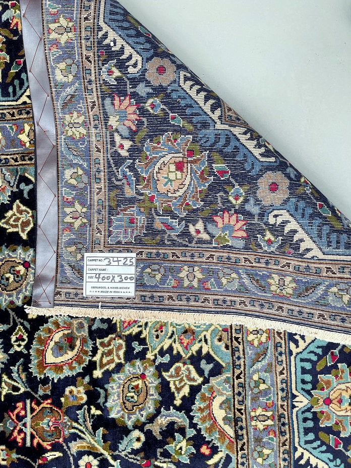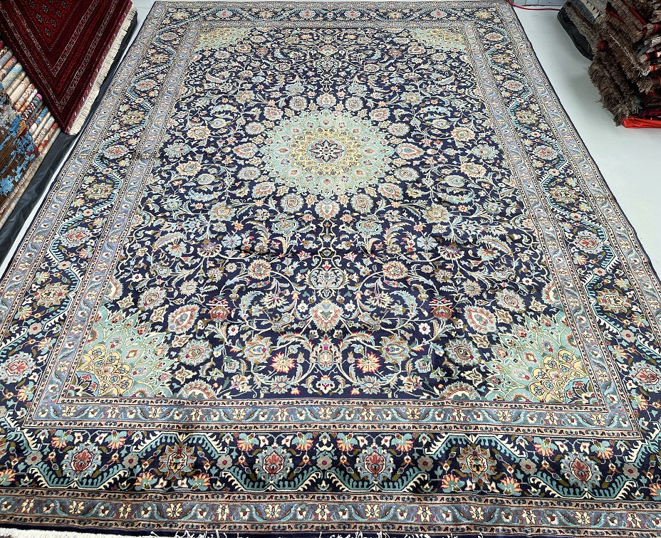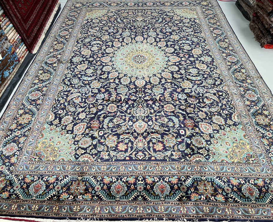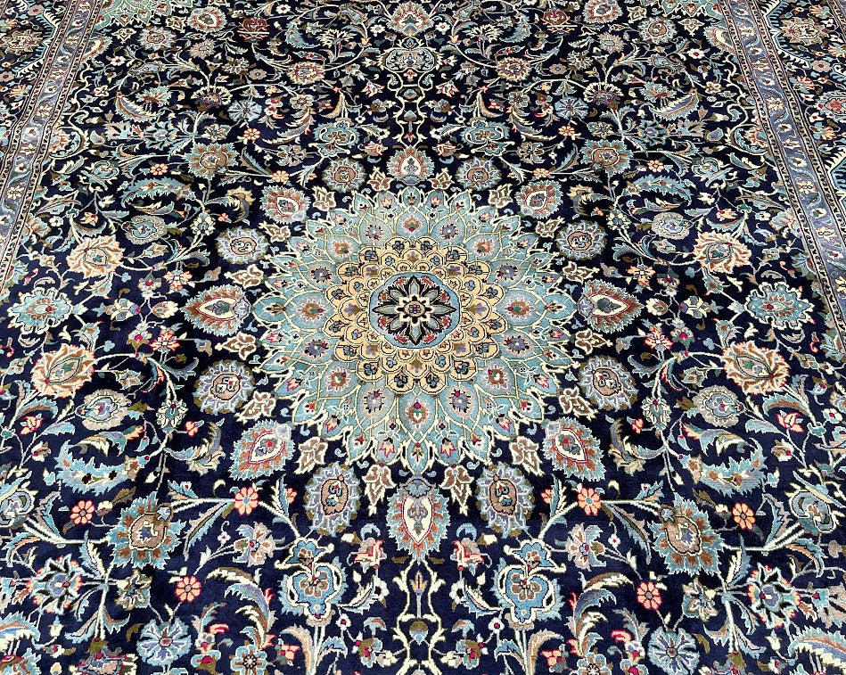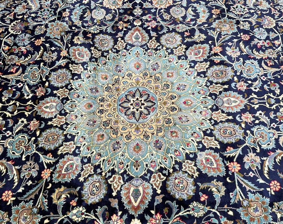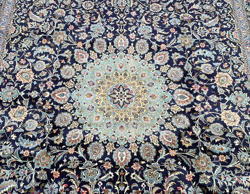 Large Room Size Authentic Handmade Persian Kashmar Rug. Above All It Has A Pure Lamb’s Wool Pile On Cotton Base. Indigo Blue, Beige, Aqua, Green, Brown And Red Tones Dyed Using Traditional Methods.