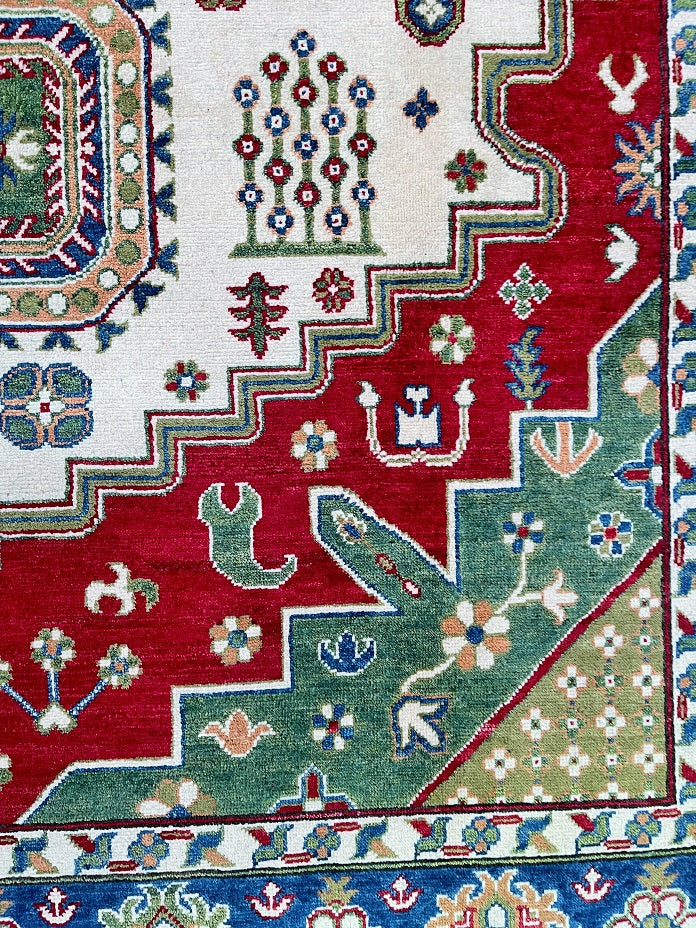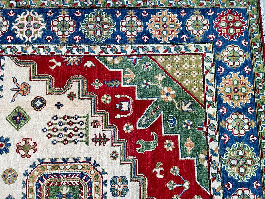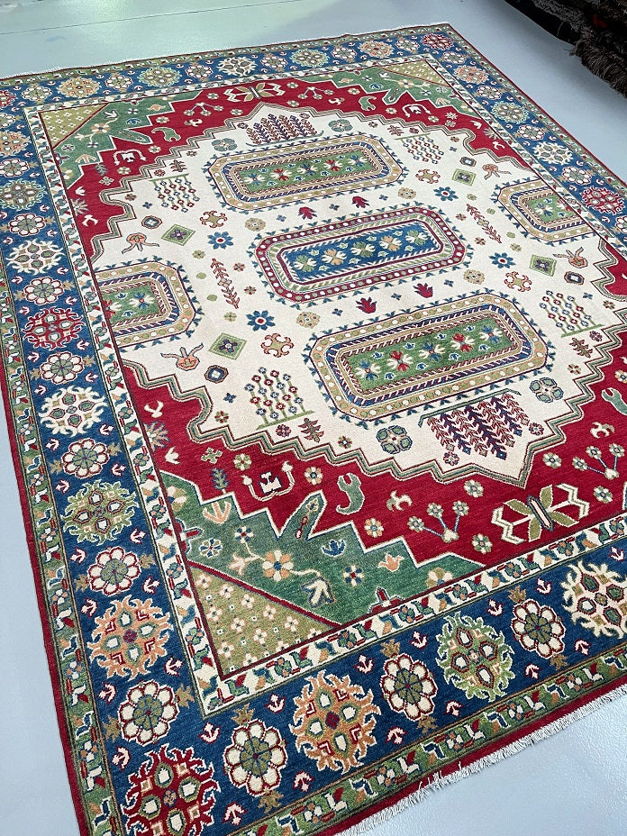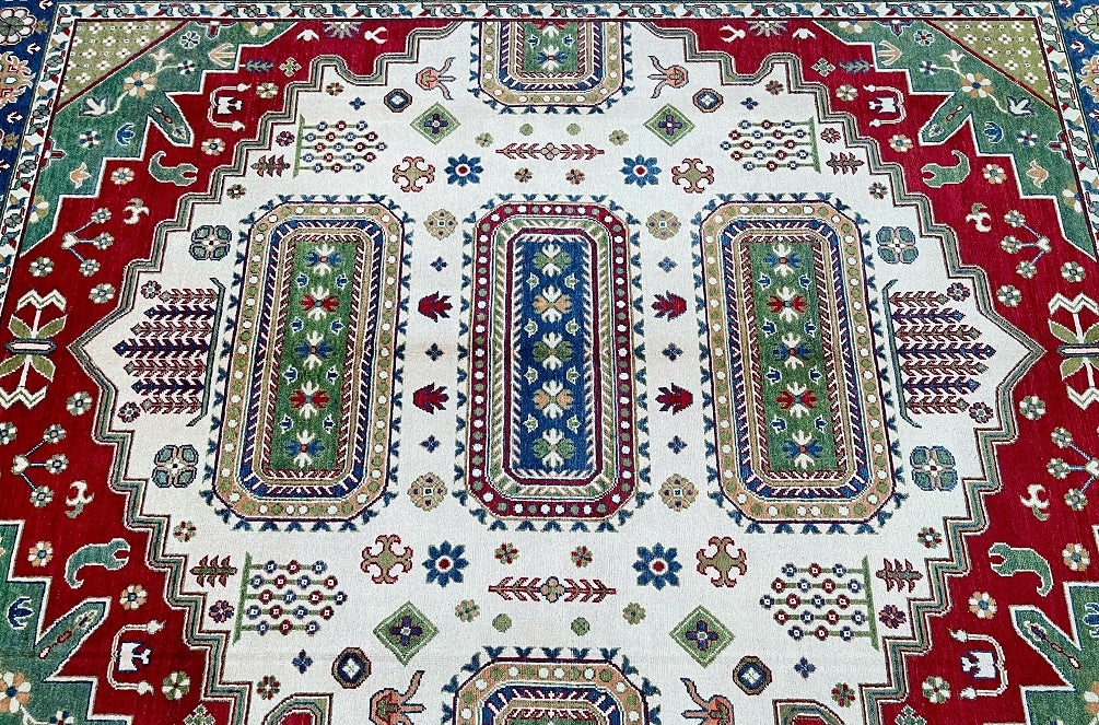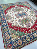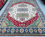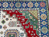 Large Room Size Caucasian Design Hand Crafted Afghan Kazak Rug. Above All It Has a Pure Hand Spun Wool Pile On Cotton Base. Beige, Blue, Yellow, Green and Red Tone Dyed Using Traditional Methods (Vegetable Dyes). Last of True Woven Tribal Art.