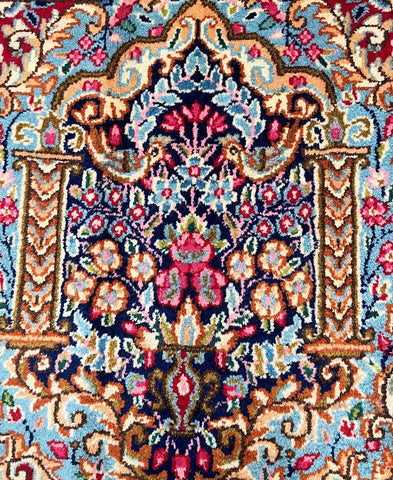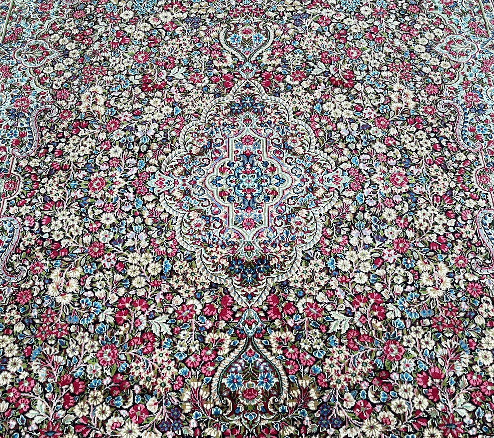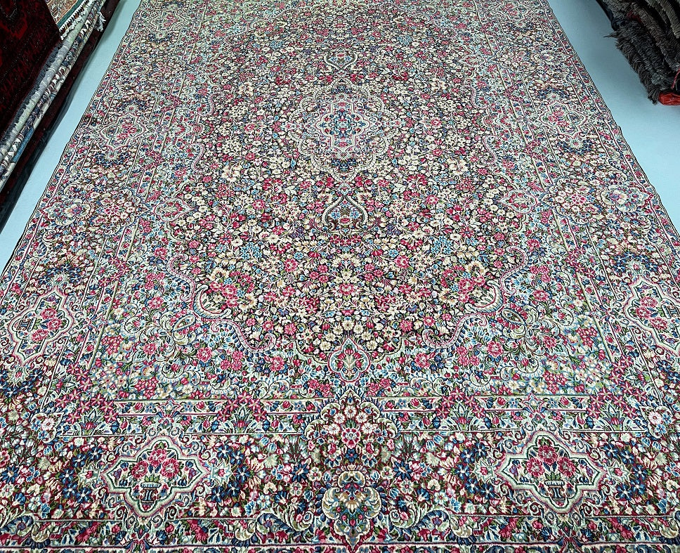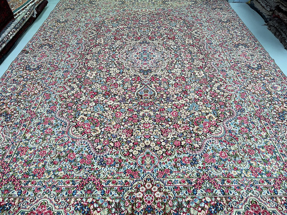 Superb Quality Large Room Size Authentic Handmade Persian Kerman Rug. Above All It Has A Fine Workmanship, You Can See The Weaving Details In The Photos From The Back Of The Rug. Pure Lamb’s Wool Pile On Cotton Base. It Also Has An Indigo Blue, Green, Pink, Beige and French Blue Tone Dyed Using Traditional Methods.
