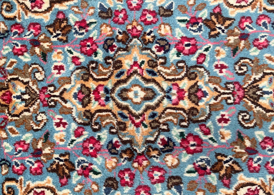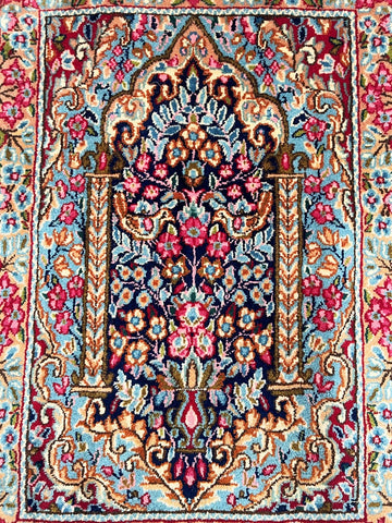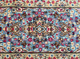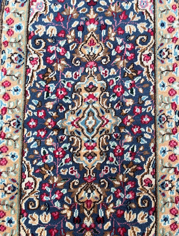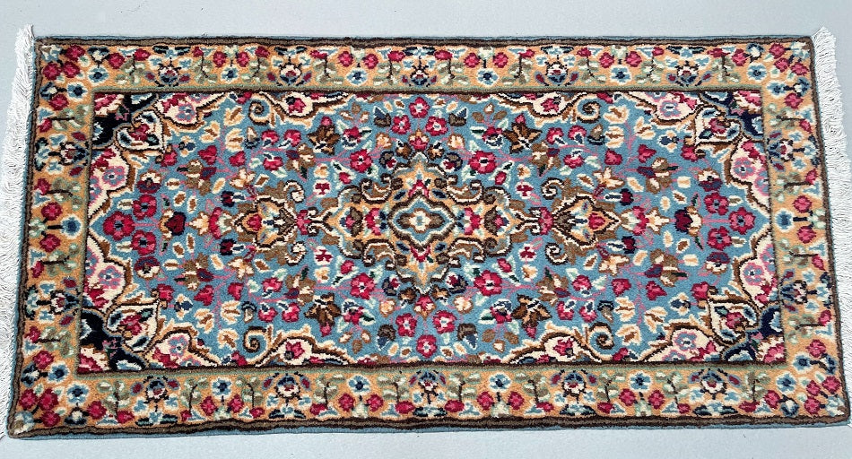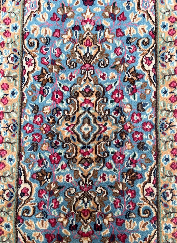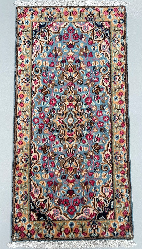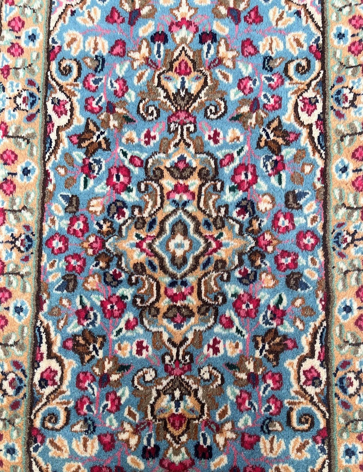 Collectible Authentic Handmade Persian Kerman Short Hall Runner Rug. Above All We Do Have This Rug In A Matching Pair. It also Has A Pure Lamb’s Wool Pile on Cotton Base. Light Blue, Beige, Pink, Peach, Brown And Red Tones Dyed Using Traditional Methods.