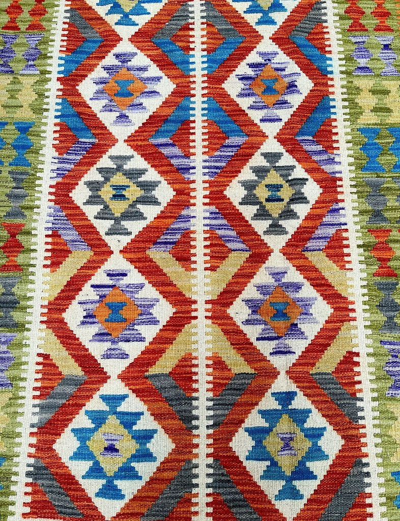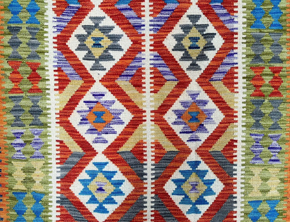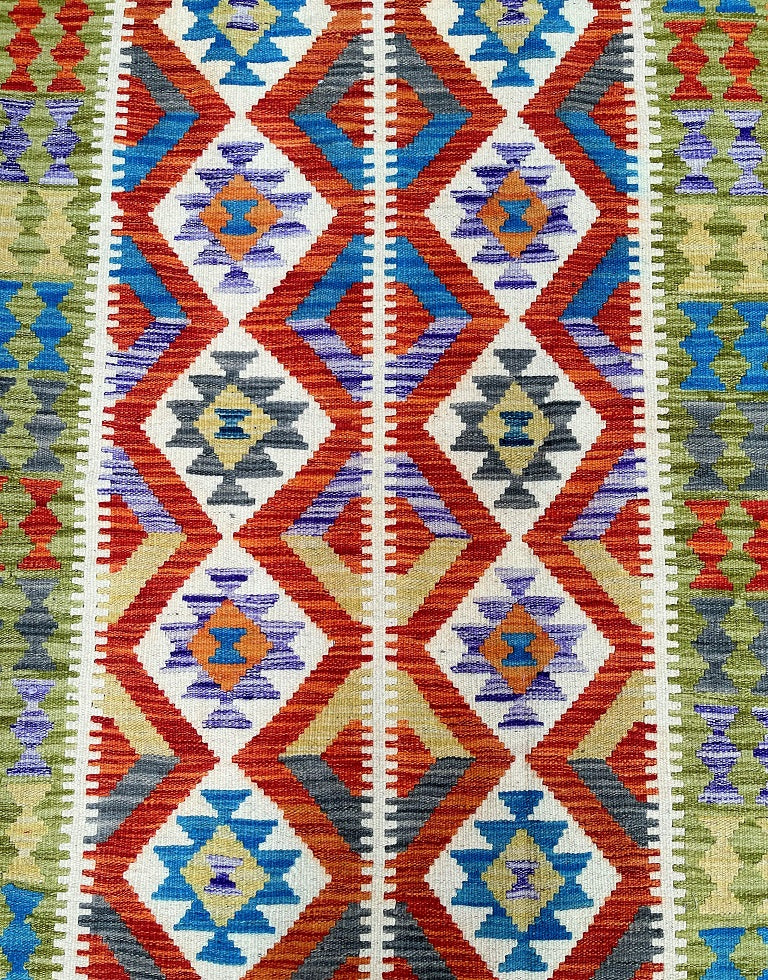 Coffee Table Size Genuine Hand Woven Afghan Kyber Kilim Rug. Above All It Has A Pure Hand Spun Wool Pile On Wool Base. Vibrant Tone Dyed Using Vegetable Roots.