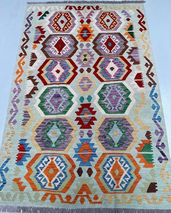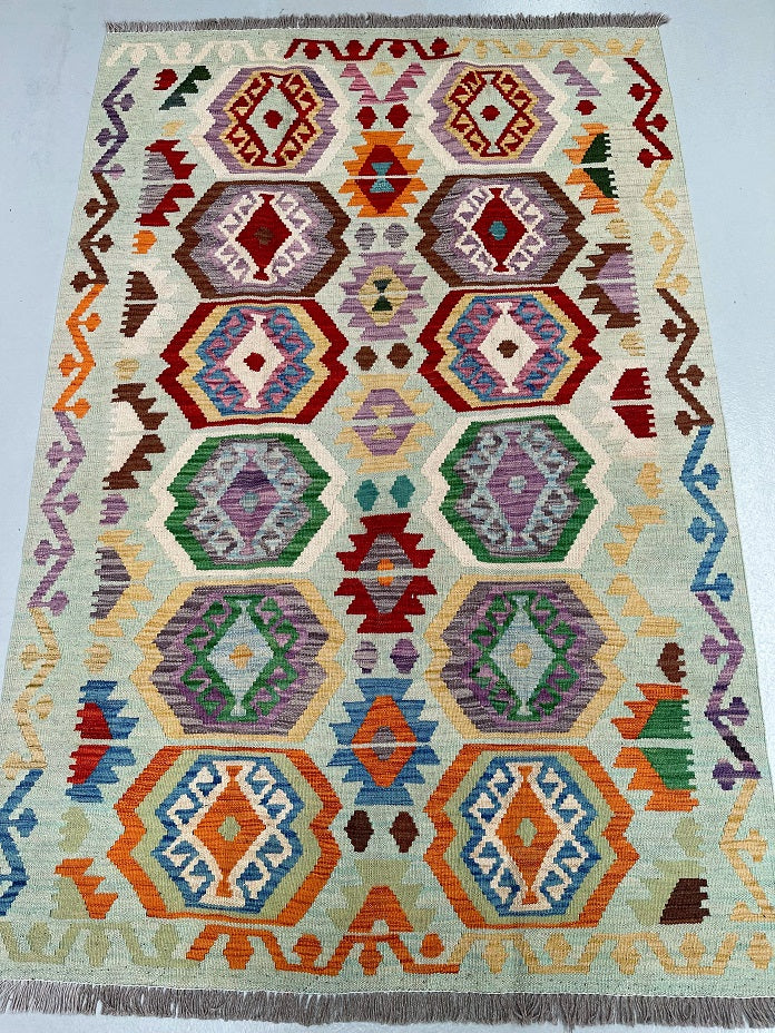 Decorative Hand Woven Afghan Aryana Kilim Rug. Above All It Is Reversible. It Also Has A Pure Hand Spun Wool Pile On Wool Base. Vibrant Boho Tones Dyed Using Vegetable Dyes.