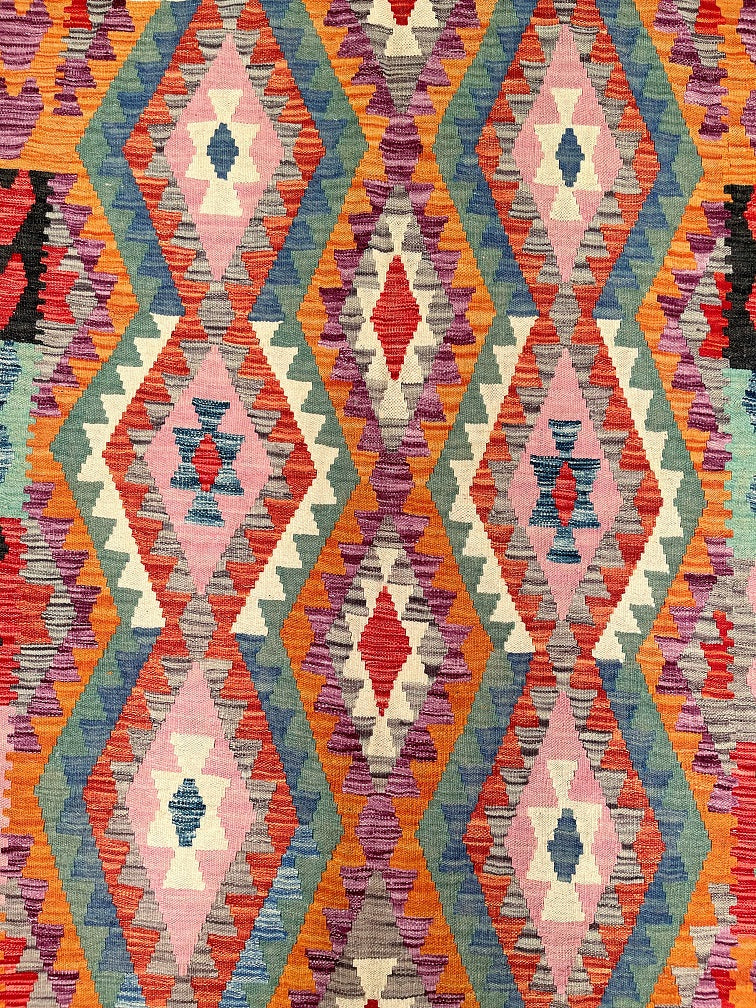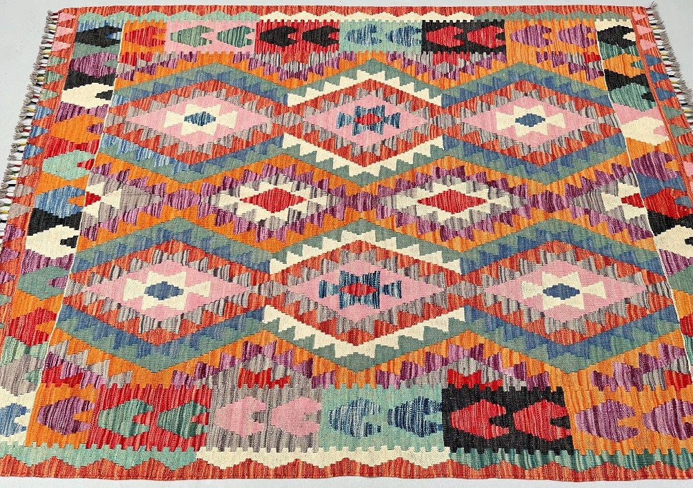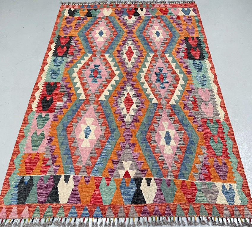 Decorative Hand Woven Boho Design Tribal Afghan Waziri Kilim Rug. Above All It Has A Pure Hand Spun Wool Pile On Wool Base. Vibrant Multi Colour Tone Dyed Using Traditional Methods.