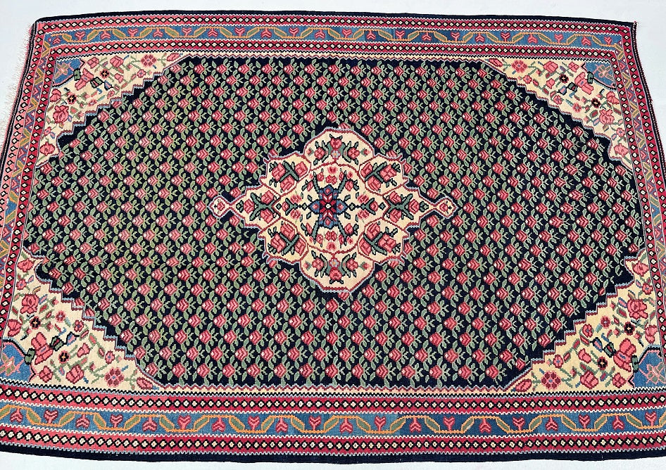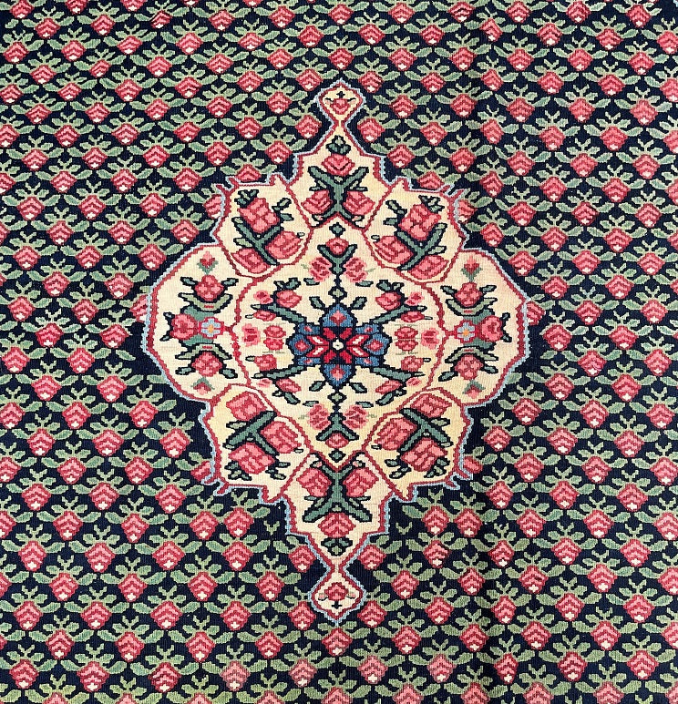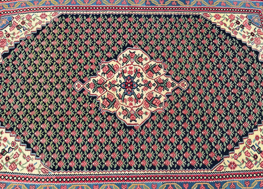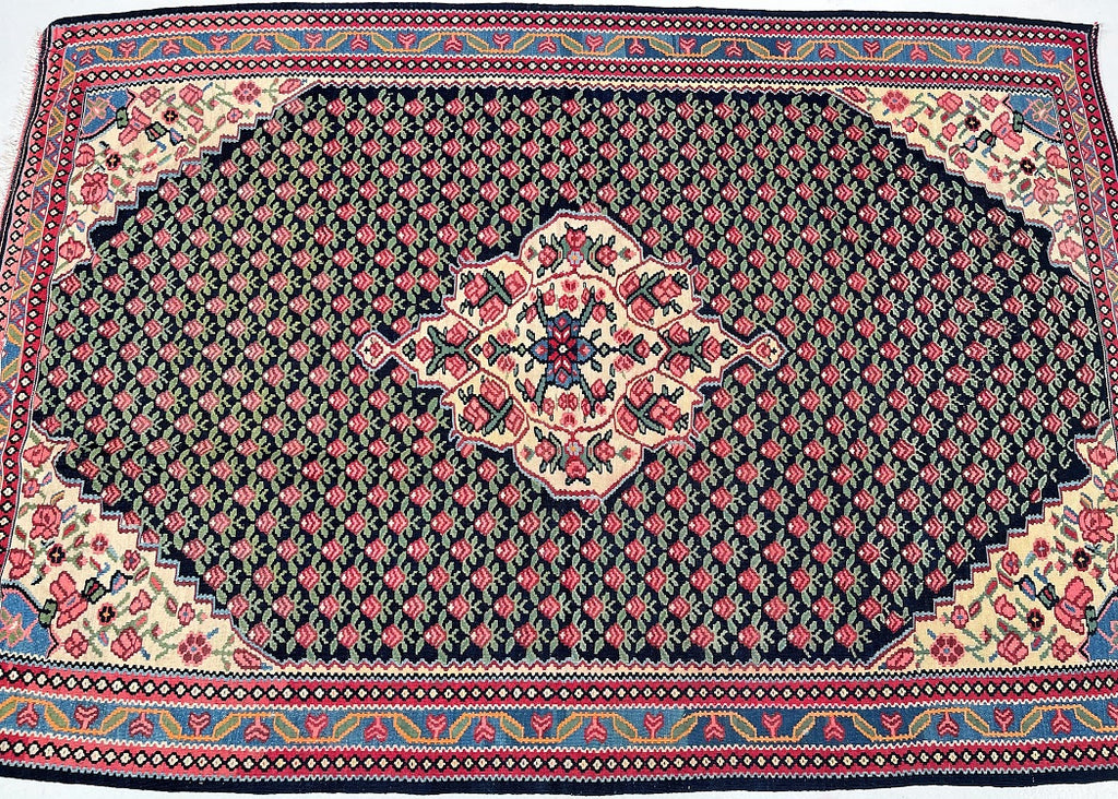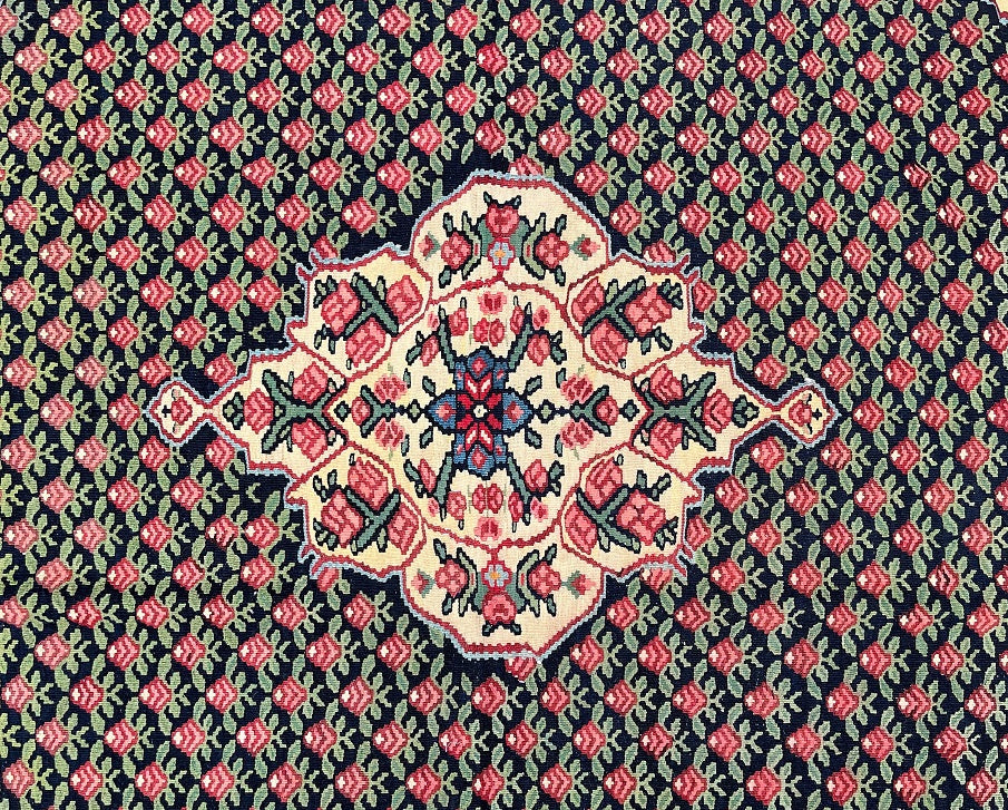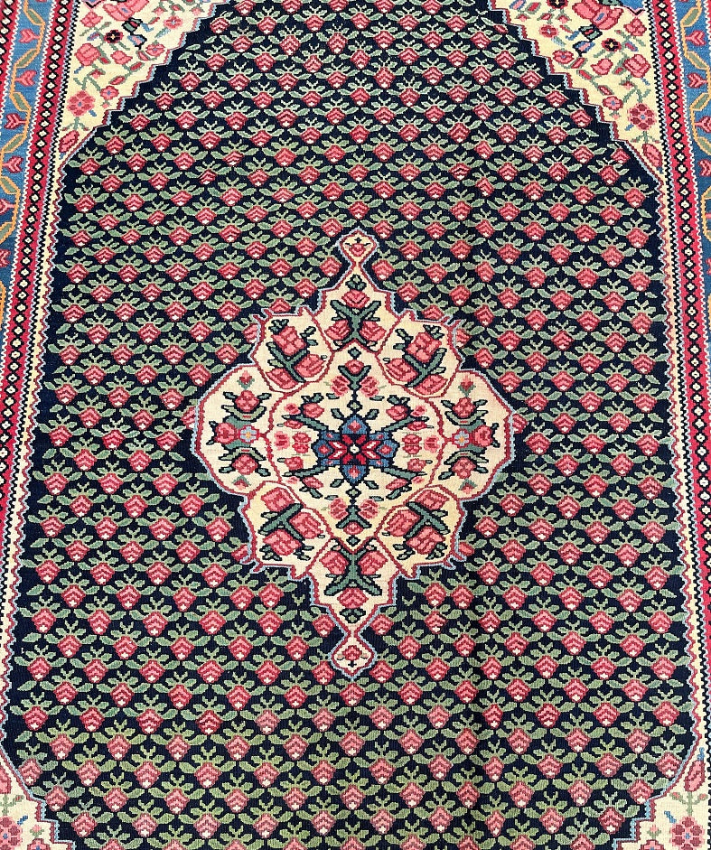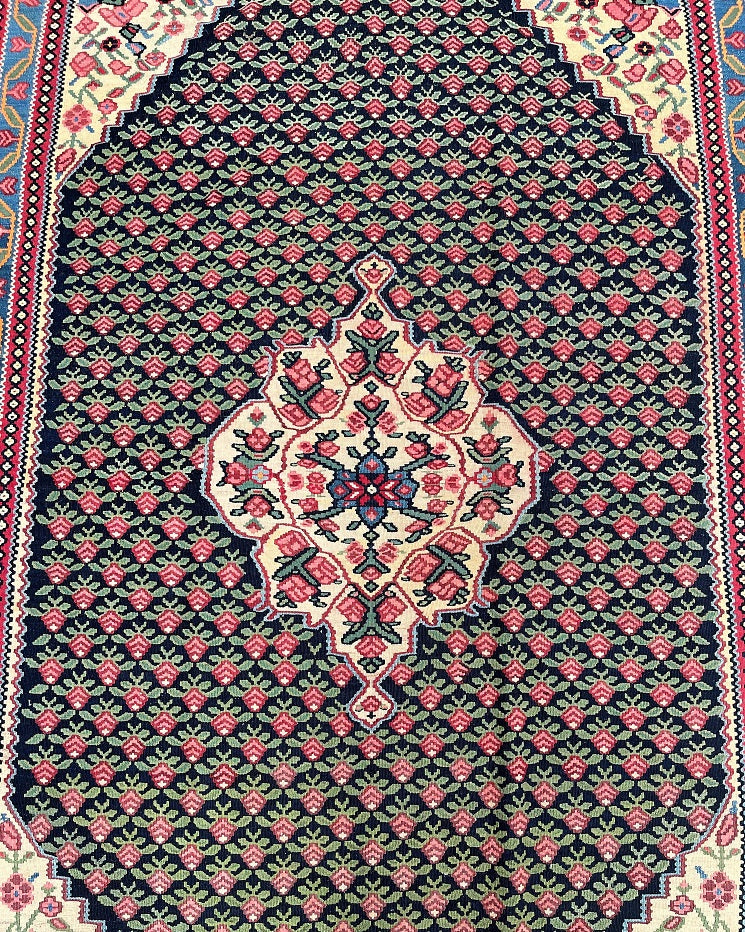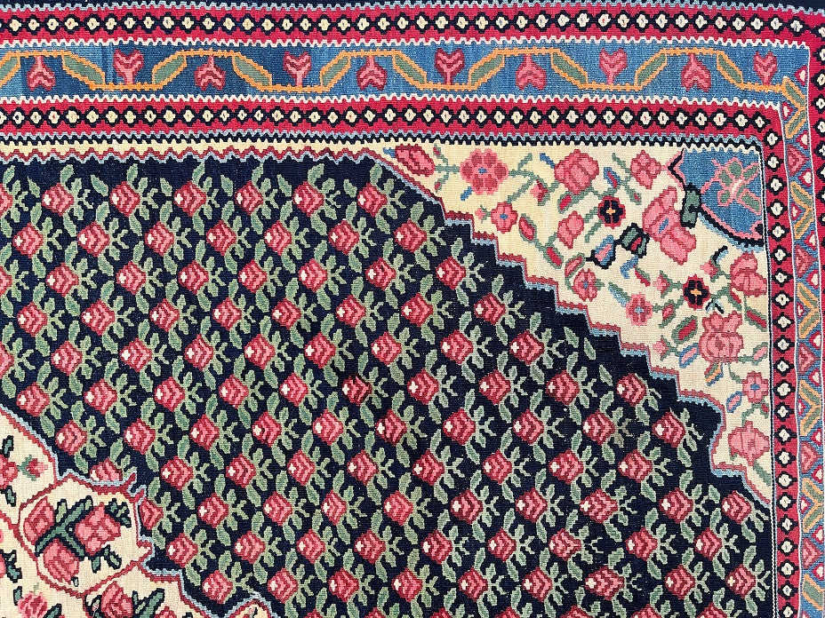 Collectable Handmade Antique Kurdish Senneh Bijar Kilim Rug Circa 1920’s. Above All It Is Hard To Find Vintage Kilim rugs Kurdistan Province. It Also Has A Pure Wool Pile On Wool Base. Black, Red, Beige, Pink, Blue, Green And Green Tones Dyed Using Traditional Methods.