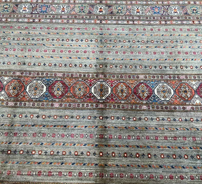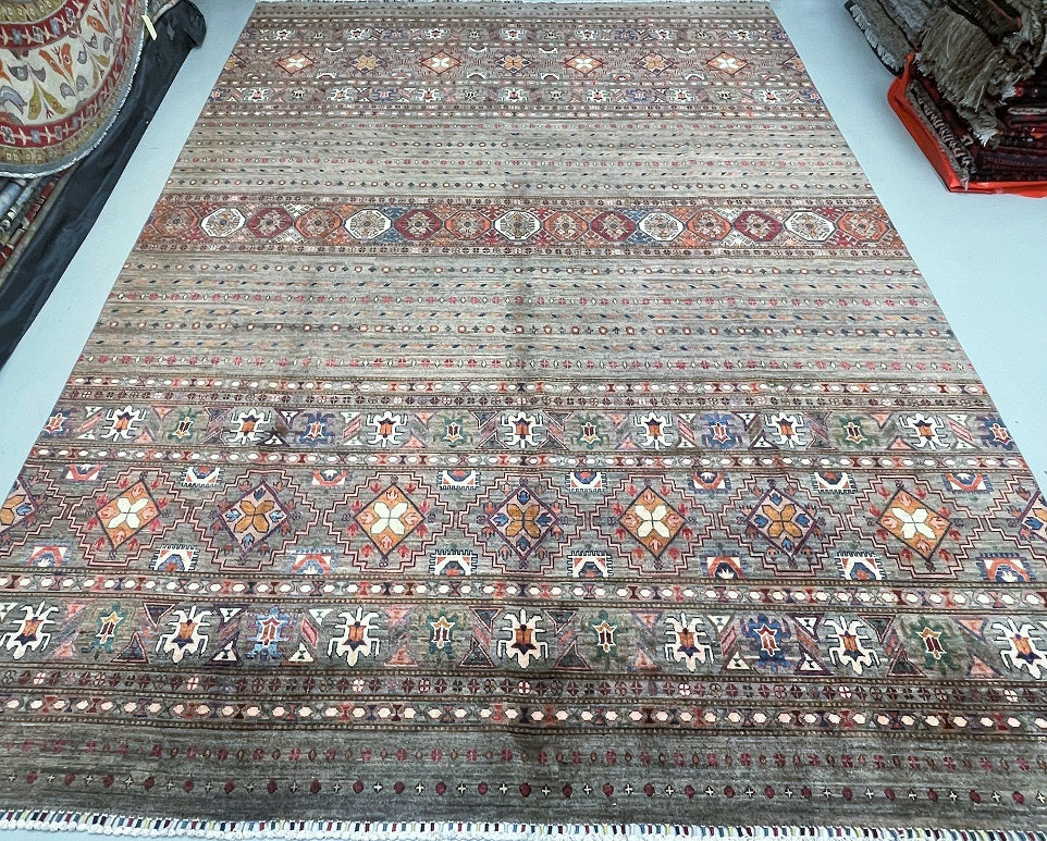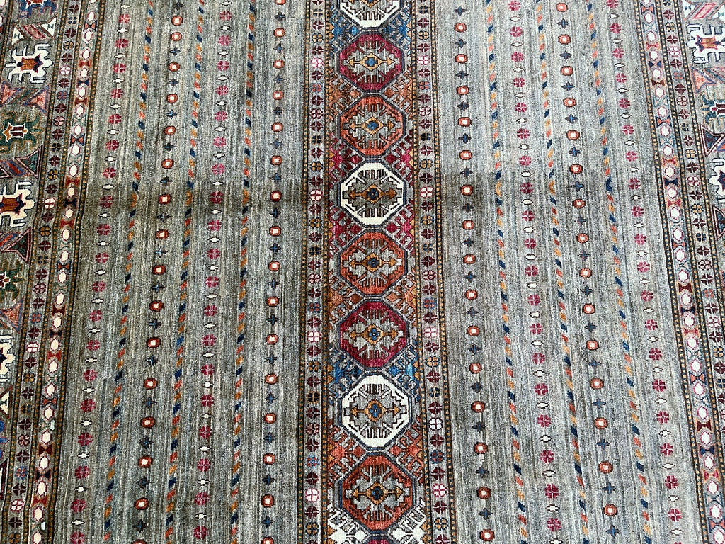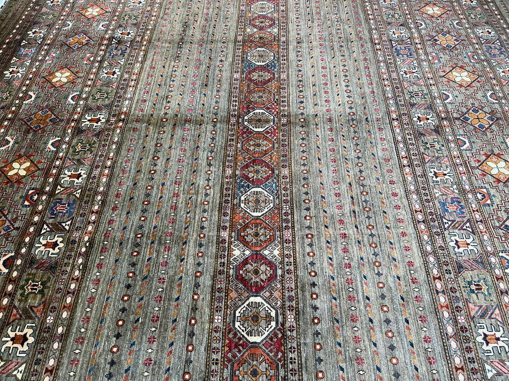 Decorative Large Room Size Hand Knotted Afghan Super Kazak Afghan Rug. Above All It Has A Lamb's Wool Pile On Cotton Base. Soft Stone Grey And Light Taupe Ground With Accents Of Terracotta, Rust Red, Ivory, Muted Mustard, Slate Blue, Navy, Olive Green And Hints Of Burgundy Throughout The Tribal Motifs Dyed Using Traditional Methods (Vegetable Dyes). Last Of True Woven Nomadic Art.