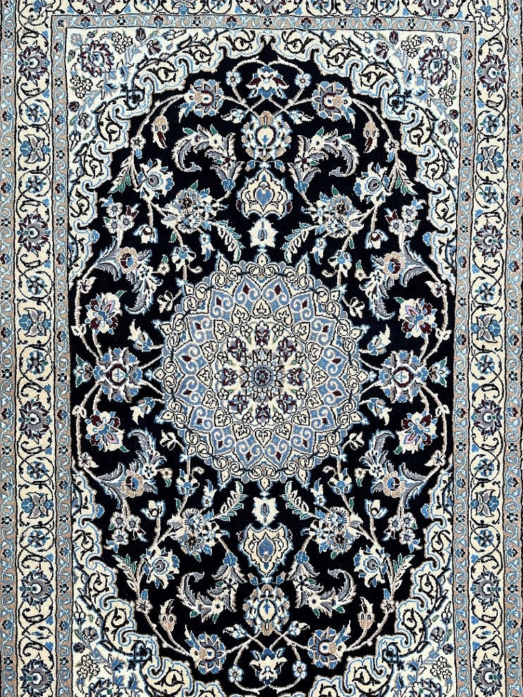 Superb Coffee Table Size Genuine Hand Knotted Persian Nain Carpet. Above All It Has A Lamb’s Wool Pile On Cotton Base. Indigo Blue, Beige, Burgundy, Green, Pink And Aqua Tones Dyed Using Traditional Methods.