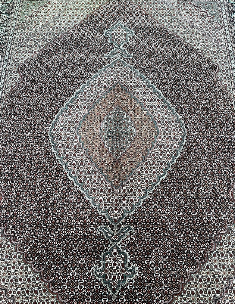 Superb Large Room Size Genuine Handmade Mahi Persian Tabriz Rug. Above All It Has A Lamb’s Wool With Touch Of Silk Pile on Cotton Base. It Also Has A Black, Beige, Green, Brown, Blue And Gold Tone Dyed Using Traditional Methods. Pin Point Quality From Famous City Of Tabriz.