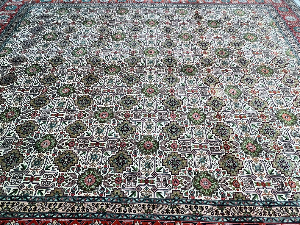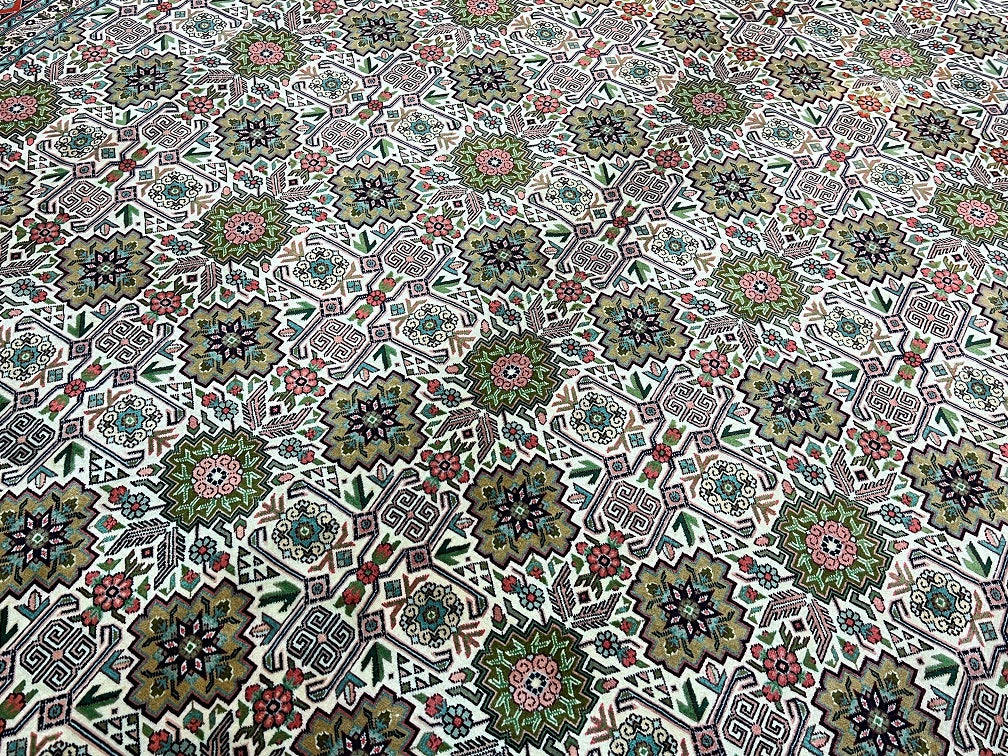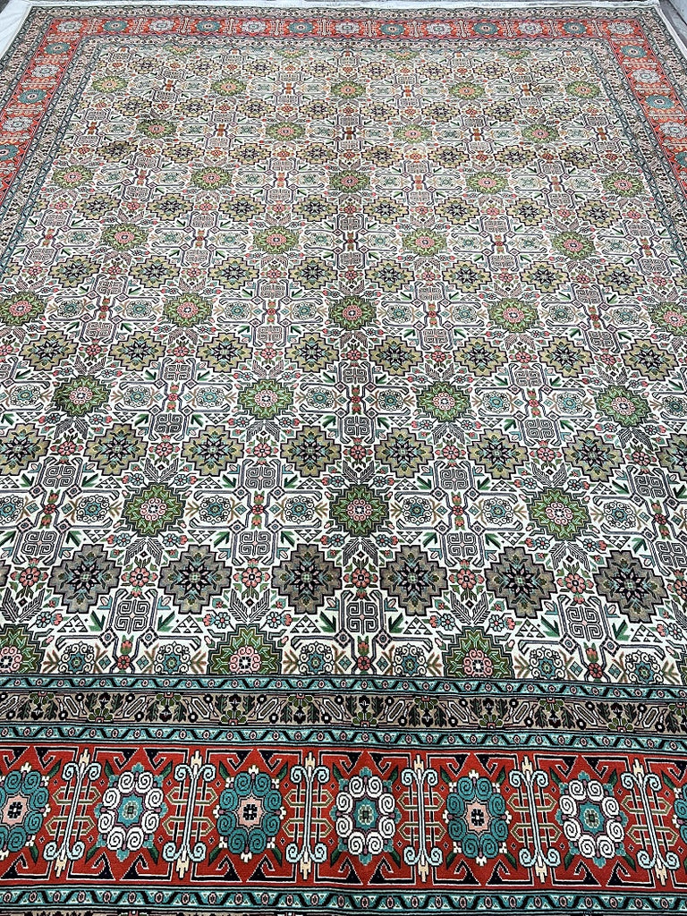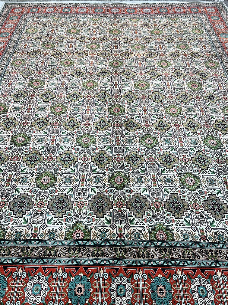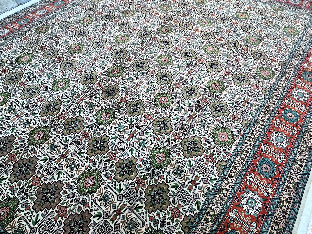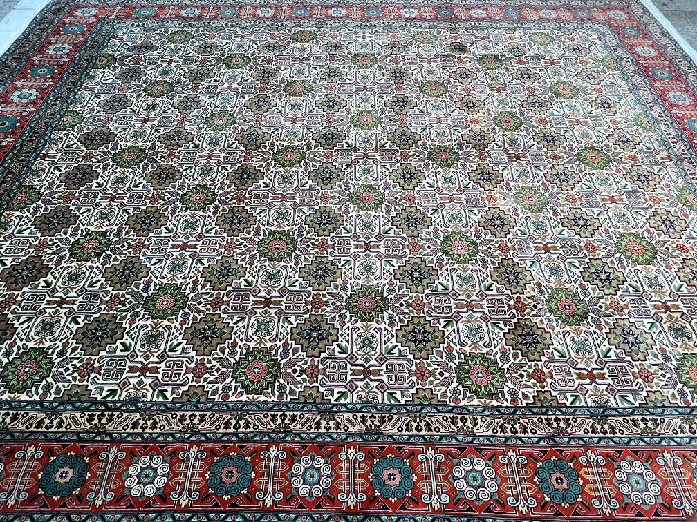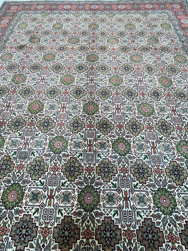 Massive Room Size Authentic Handmade Antique Persian Tabriz Rug. Please Note This Is A Genuine Piece Not An Indian Or Chinese Copy. It Also Has A Pure Lamb’s Wool Pile On Cotton Base. Beige, Red, Orange, Burgundy, Blue And Green Tone Dyed Using Traditional Methods.