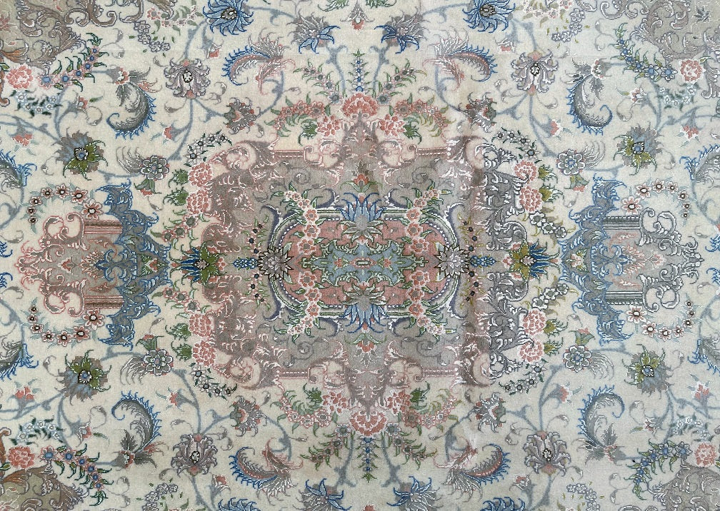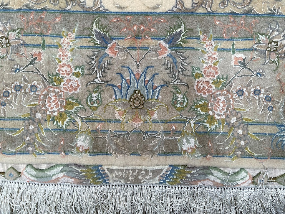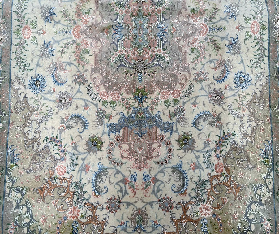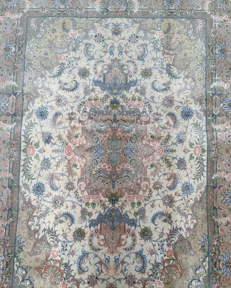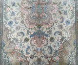 High Quality Authentic Handmade Persian Tabriz Rug Signed. Above All It Is Kurk Wool And Silk Pile On Silk Base. Soft Tones, Beige, Light Blue, Grey, Pink And Green Dyed Using Traditional Methods. It Is Also Pin-Point Quality Weave That Is Considered To Be A Masterpiece (Investment Item).