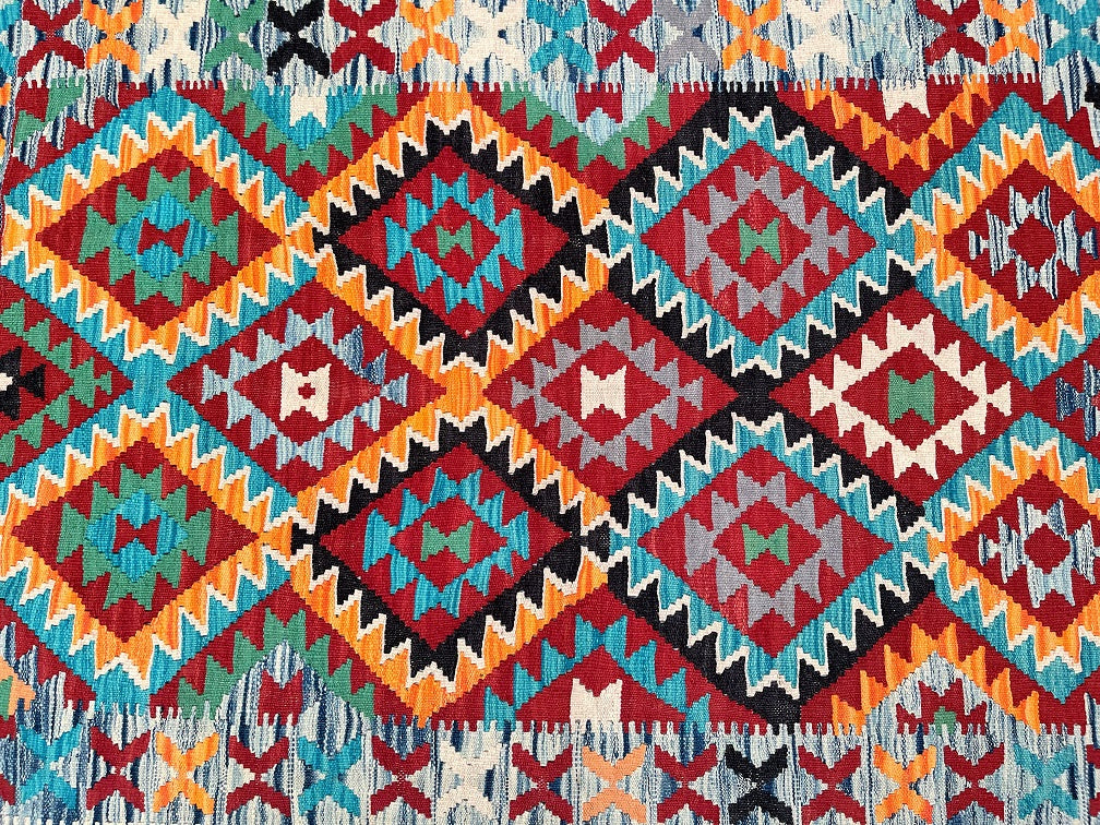 Coffee Table Size Nomadic Hand Woven Afghan Waziri Kilim Rug. Above All It Is A Versatile Size. It Also Has A Pure Wool Pile On Wool Base. Vibrant Multi Colour Tone Dyed Using Traditional Methods.