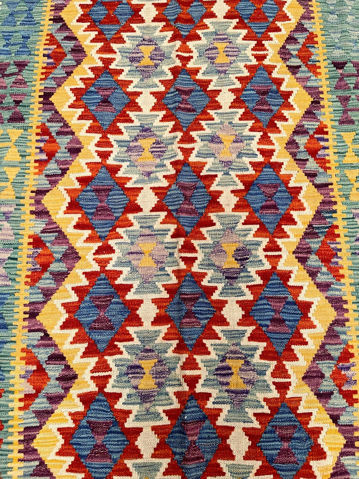 Decorative Hand Woven Boho Design Tribal Afghan Waziri Kilim Rug. Above All It Has A Pure Hand Spun Wool Pile On Wool Base. Vibrant Multi Colour Tone Dyed Using Traditional Methods.