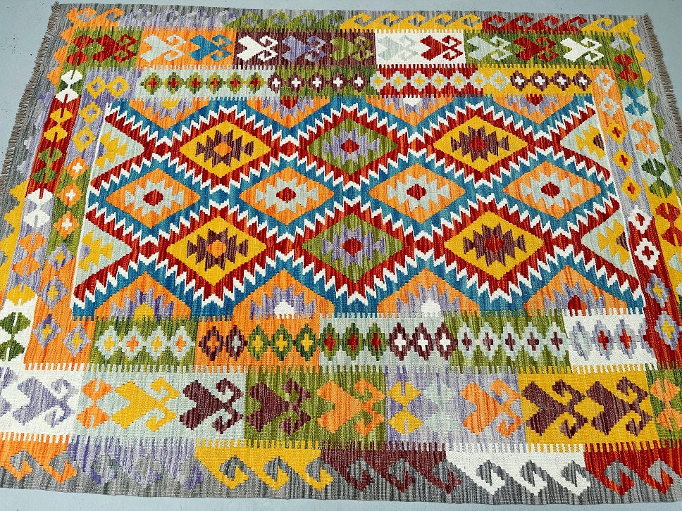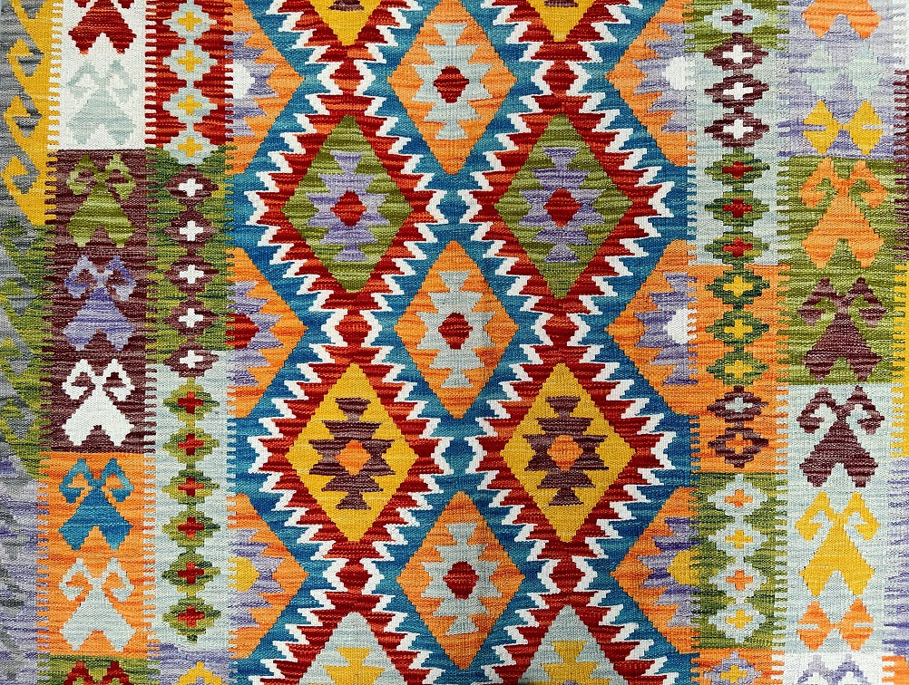 Decorative Hand Woven Boho Design Tribal Afghan Waziri Kilim Rug. Above All It Has A Pure Hand Spun Wool Pile On Wool Base. Vibrant Multi Colour Tone Dyed Using Traditional Methods.