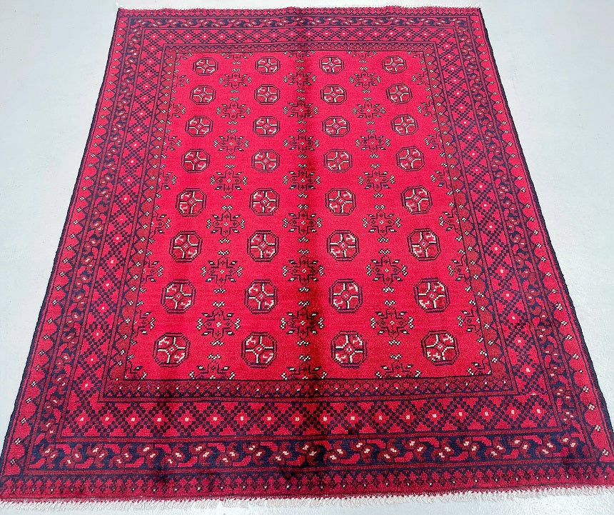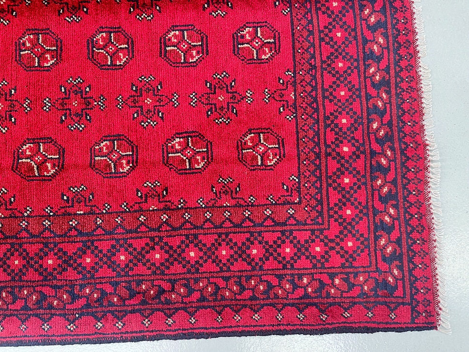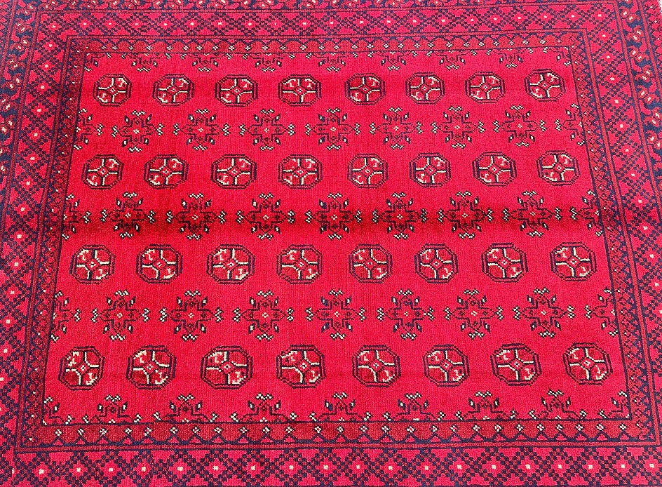 Gorgeous Coffee Table Size Handmade Afghan Aqcha Rug. Above All It Has A Pure Hand Spun Wool Pile On Cotton Base. It Also Has A Rich Red/Burgundy Tone Dyed Using Traditional Methods.