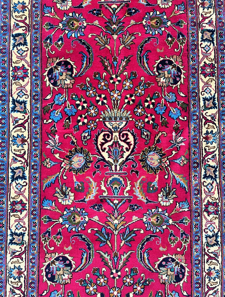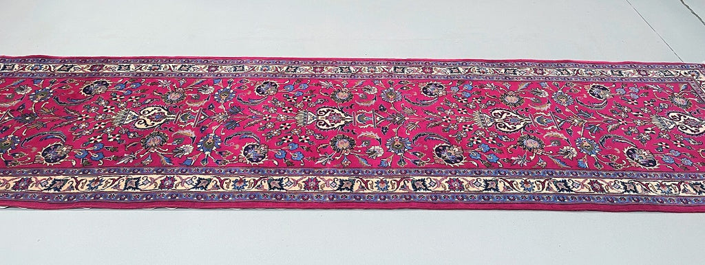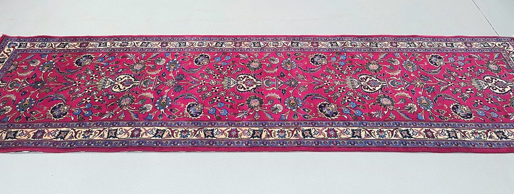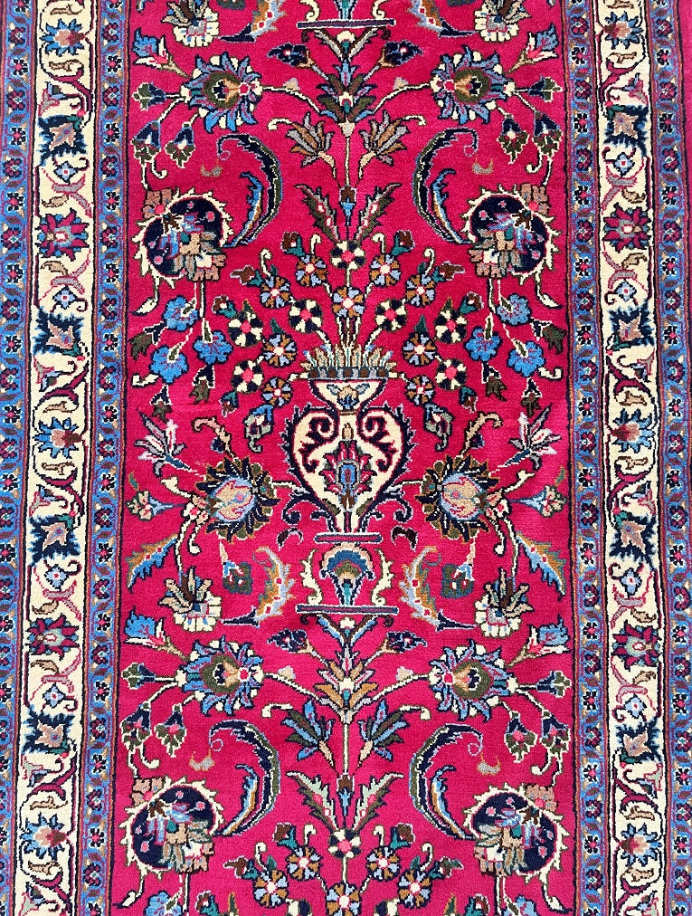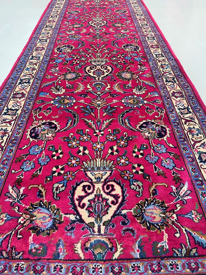 Dense Quality Authentic Handmade Persian Kashmar Hall Runner. Above All It Has A Dense Pure Lamb’s Wool Pile On Cotton Base. It Also Has A Magenta Red/Pink Background Dyed Using Traditional Methods. Hard Wearing Runner Which Would Last You A Life Time.