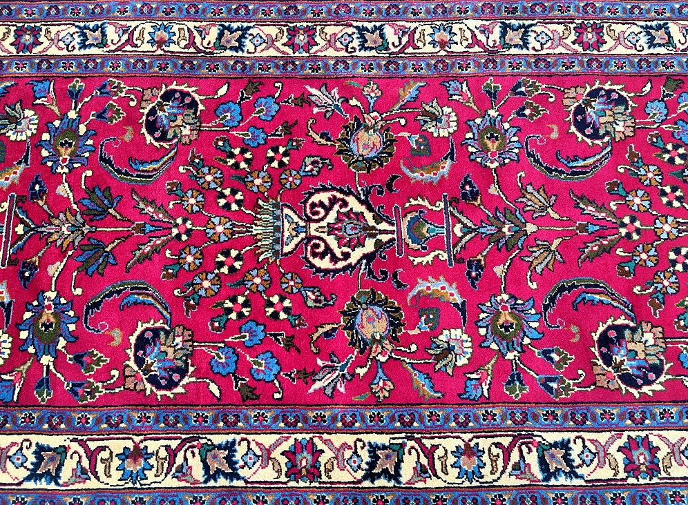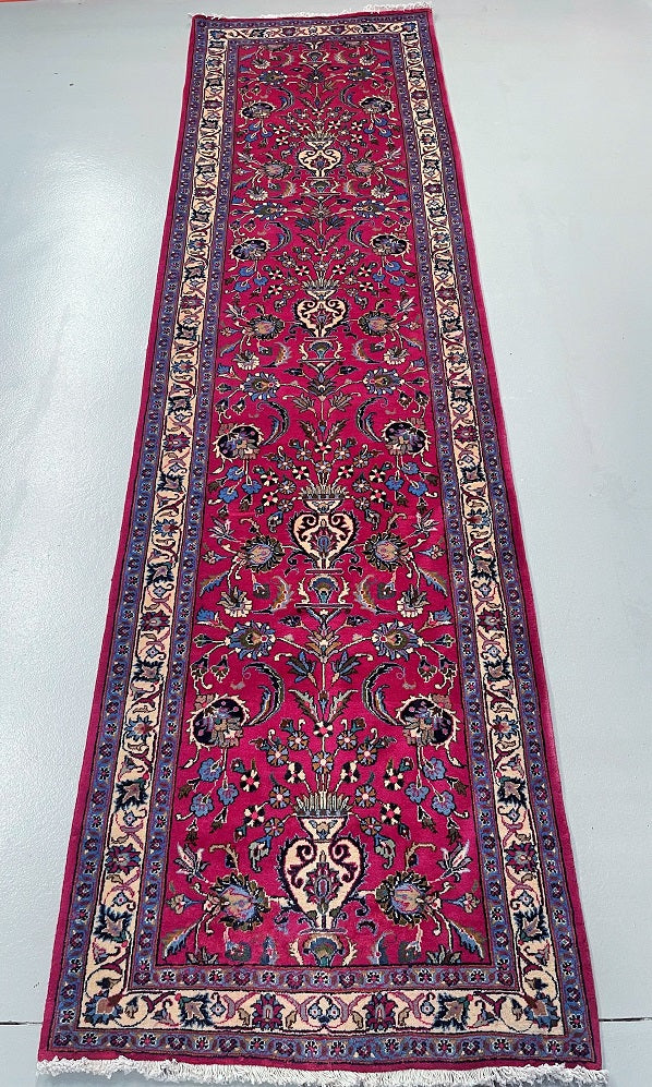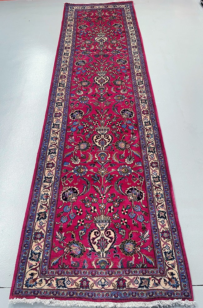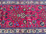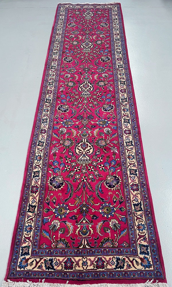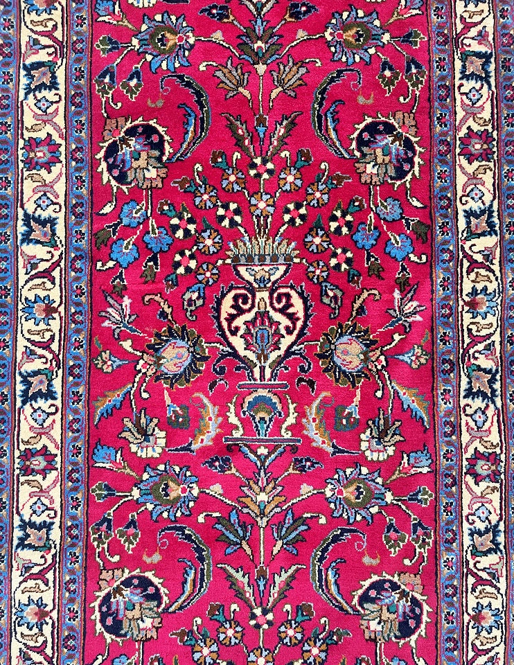 Dense Quality Authentic Handmade Persian Kashmar Hall Runner. Above All It Has A Dense Pure Lamb’s Wool Pile On Cotton Base. It Also Has A Magenta Red/Pink Background Dyed Using Traditional Methods. Hard Wearing Runner Which Would Last You A Life Time.