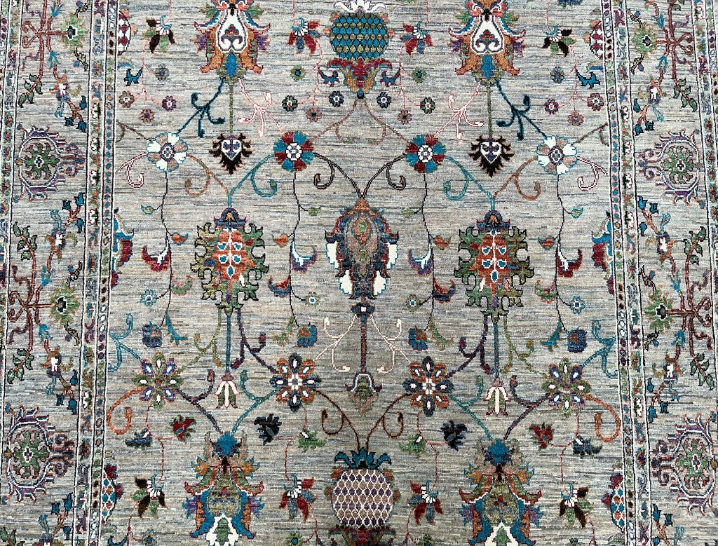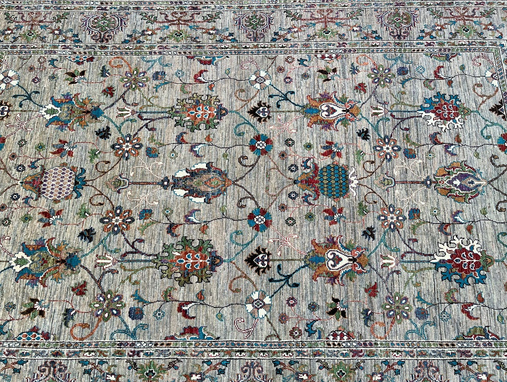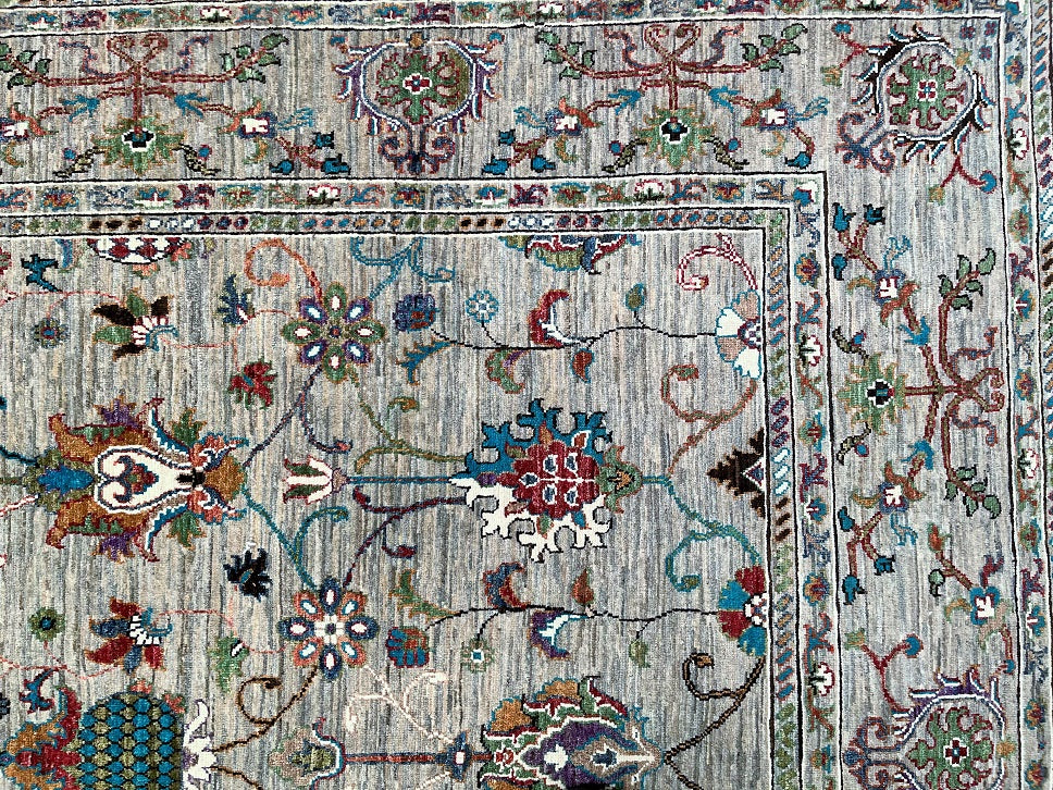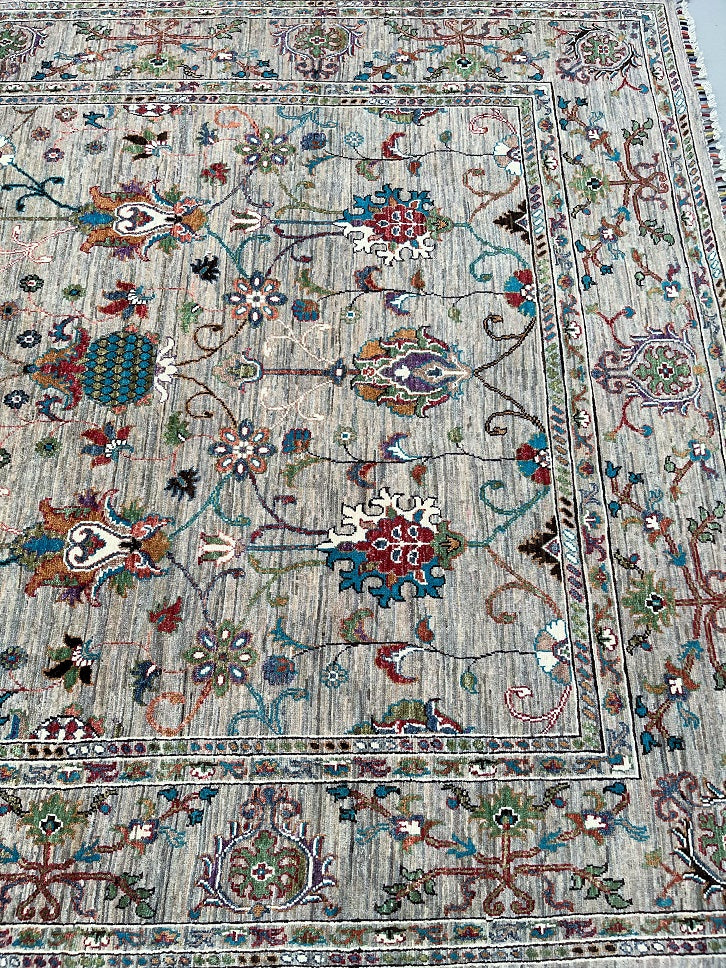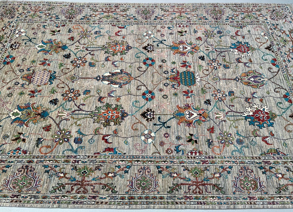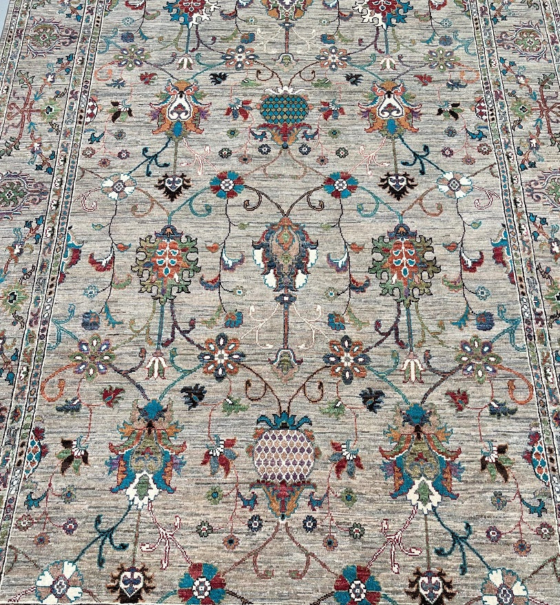 Superb Full Room Size Hand Knotted Sultani Afghan Chobi Rug. Above All It Has A Pure Lamb’s Wool Pile On Cotton Base. Soft Light Brown-Grey Field With Light Beige Undertones, Decorated With Turquoise, Sky Blue, Sage Green, Dusty Rose, Terracotta, Burgundy, Olive And Ivory Accents Dyed Using Traditional Methods (Vegetable Dyes). Last Of True Woven Nomadic Art.