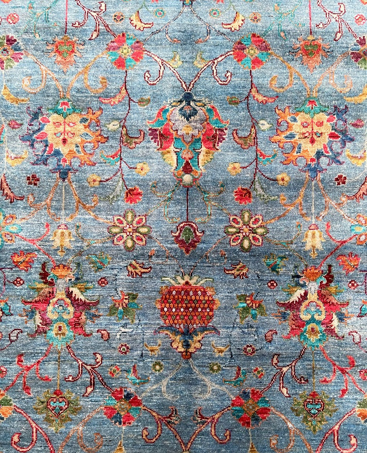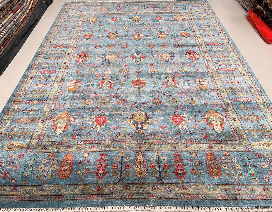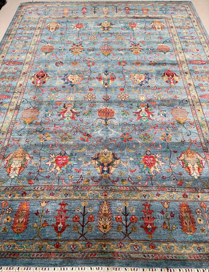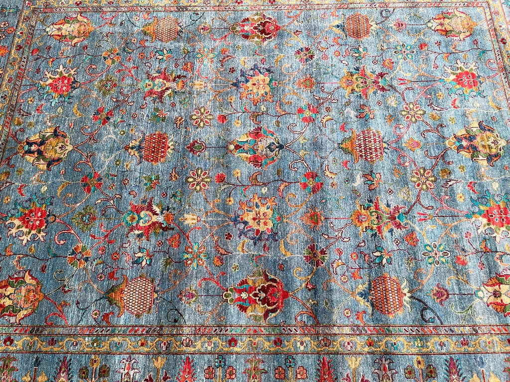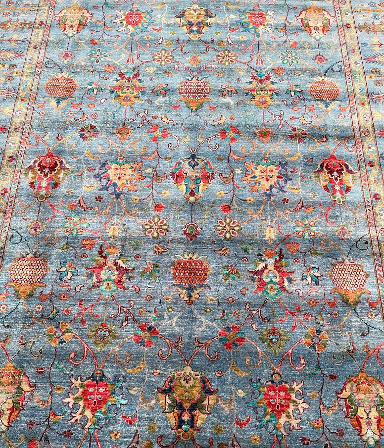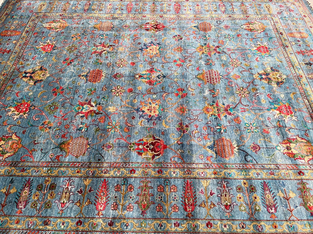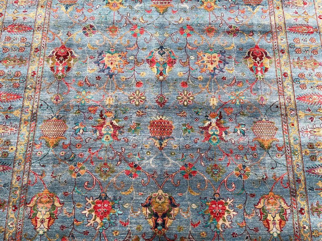 Superb Large Room Size Hand Knotted Sultani Afghan Chobi Rug. Above All It Has A Pure Lamb’s Wool Pile On Cotton Base. Light Blue, Beige, Pink, Terracotta, Red, Gold, Green And Orange Tone Dyed Using Traditional Methods (Vegetable Dyes). Last of True Woven Nomadic Art.