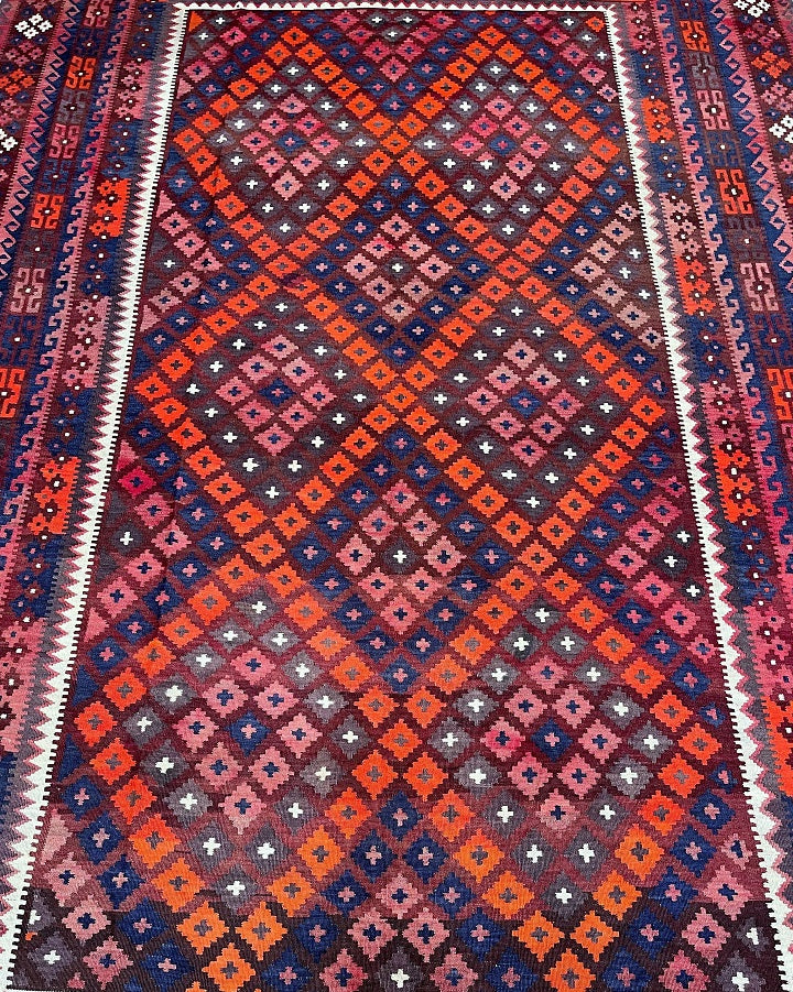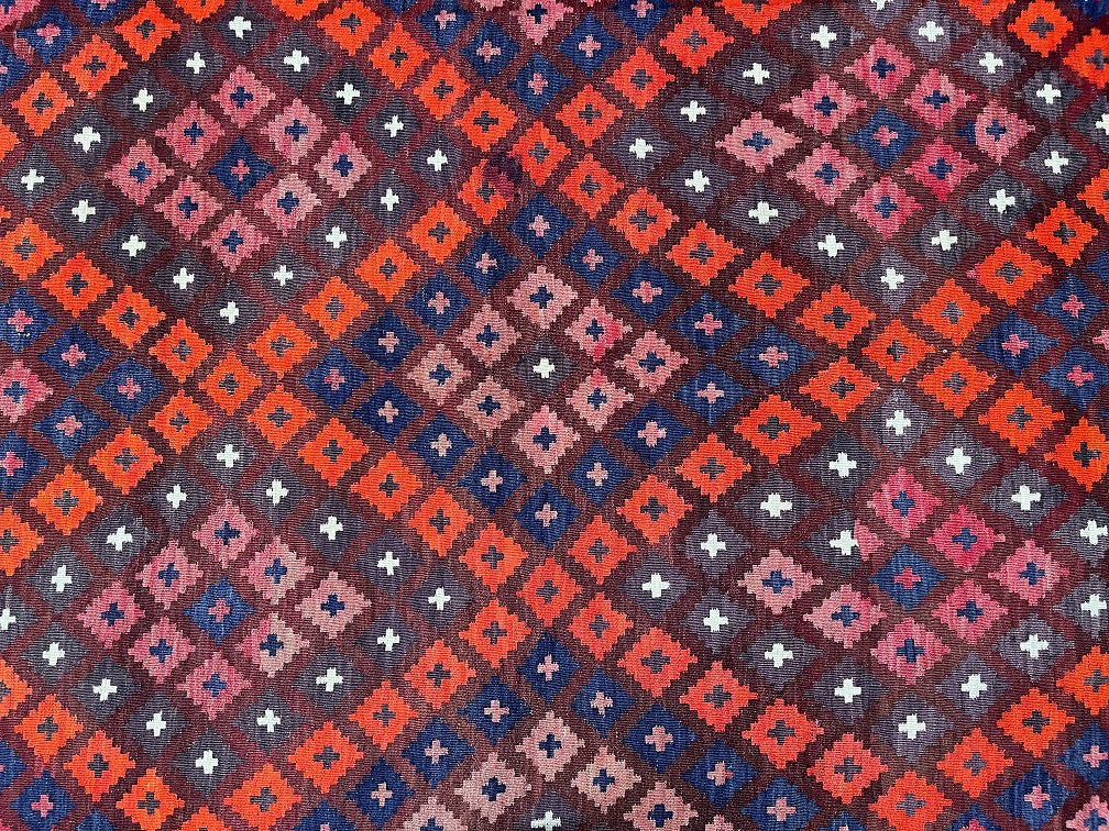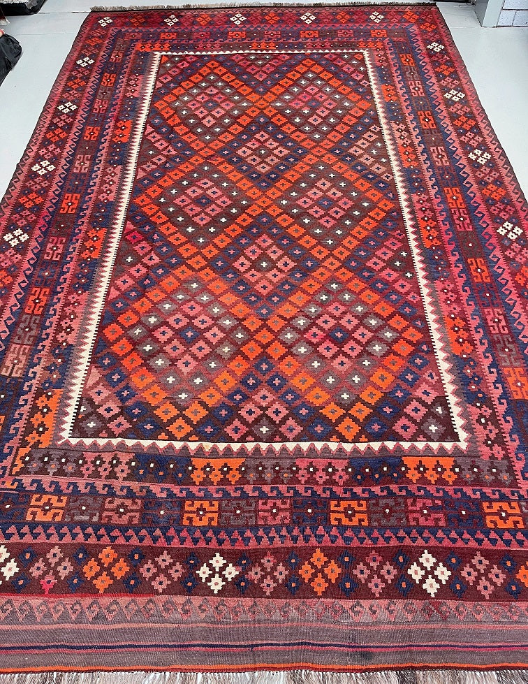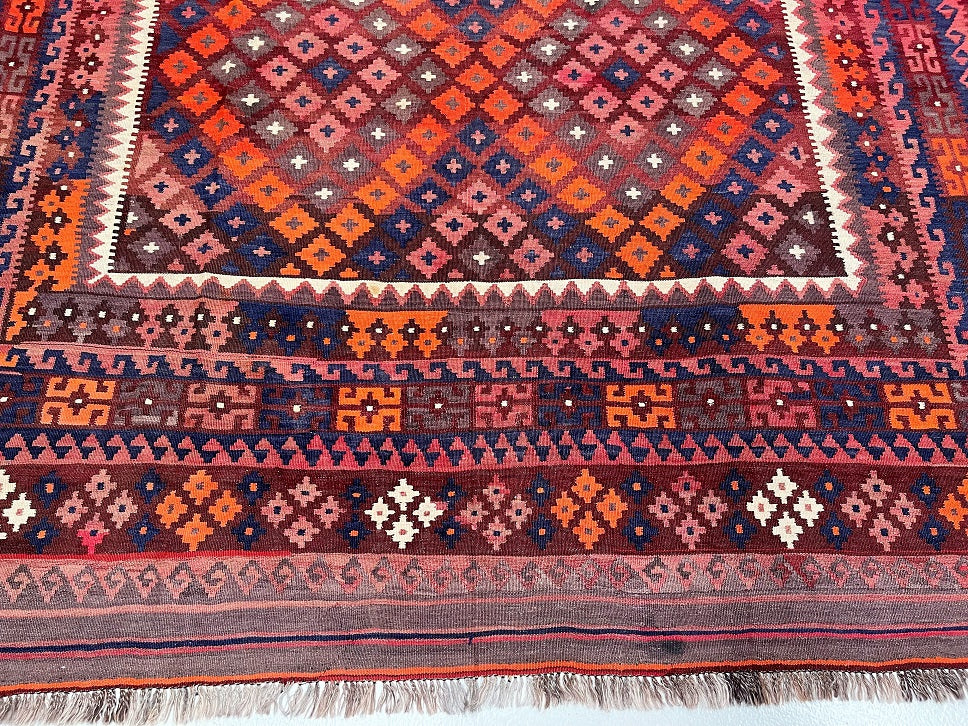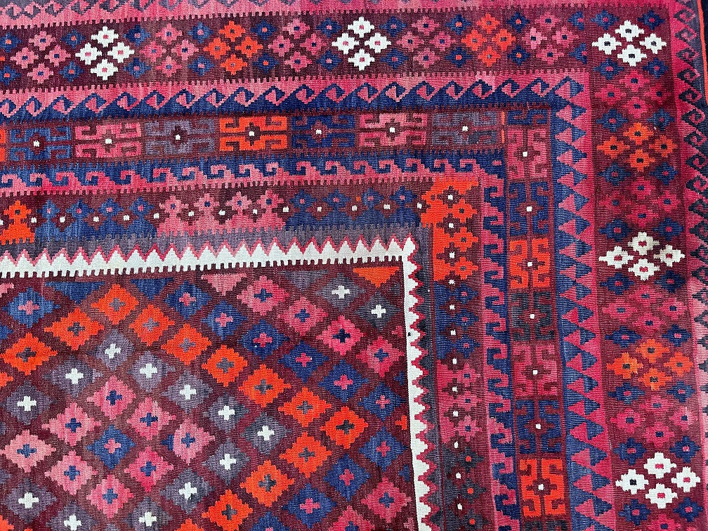 Authentic Large Room Size Hand Woven Vintage Afghan Meymaneh Kilim Rug – Circa 1990’s, Crafted From Pure Wool. This Striking Vintage Piece Showcases The Bold Tribal Character That Meymaneh Rugs Are Renowned For.