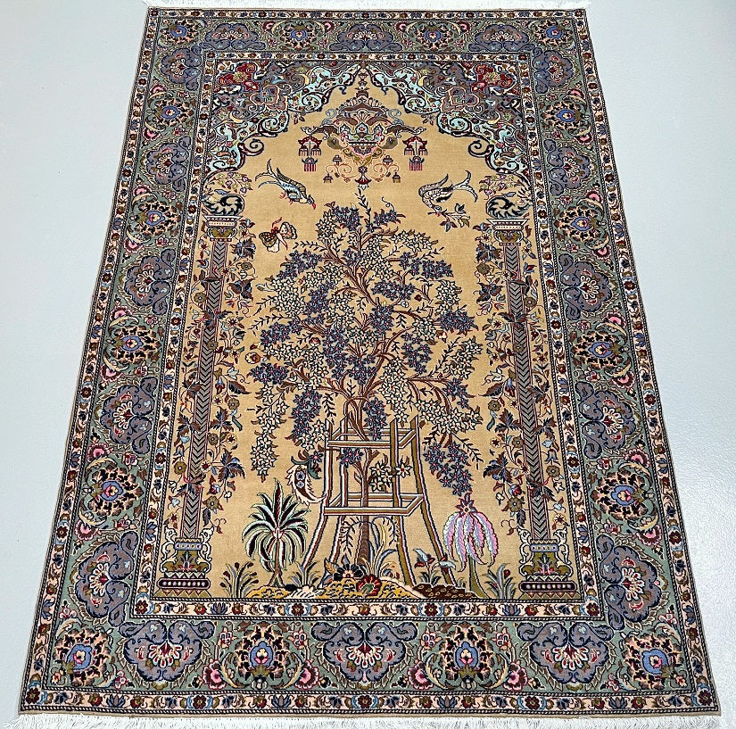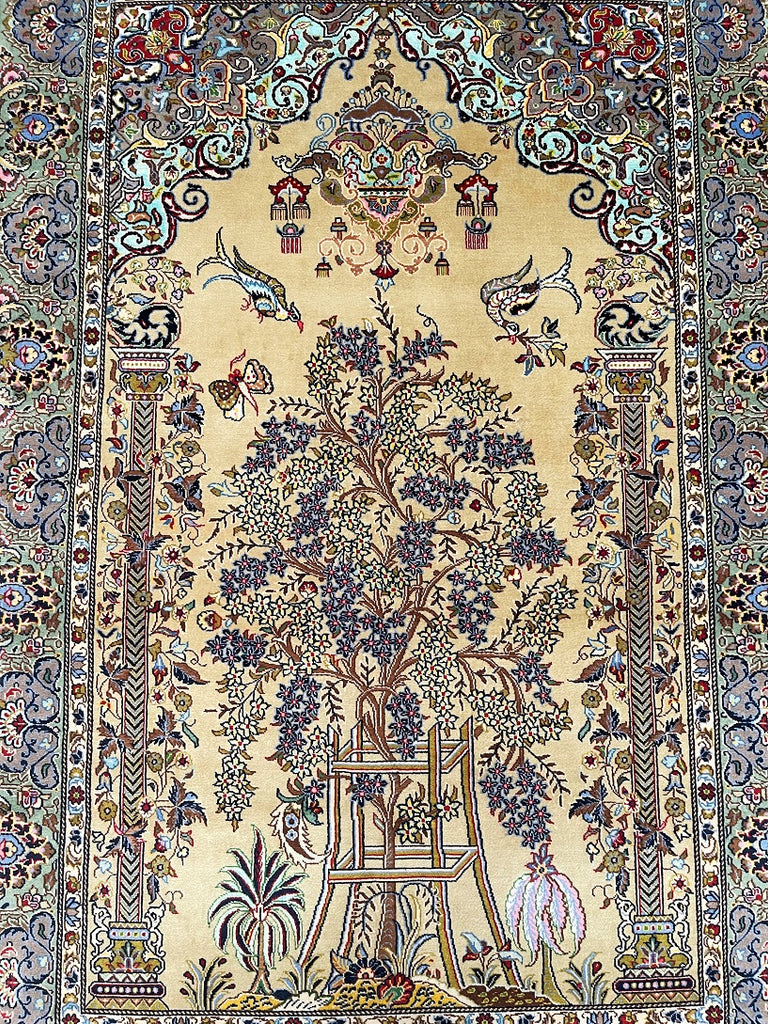 Masterpiece Authentic Handmade Persian Kashan Rug. Above All This Is A Very Unique Pattern Know As Tree Of Life Or Gate Of Paradise. Gorgeous Beige/Caramel, Blues, Green, Red And Brown Tone Dyed Using Traditional Methods. Lamb's Wool And Silk Pile On Cotton Base.