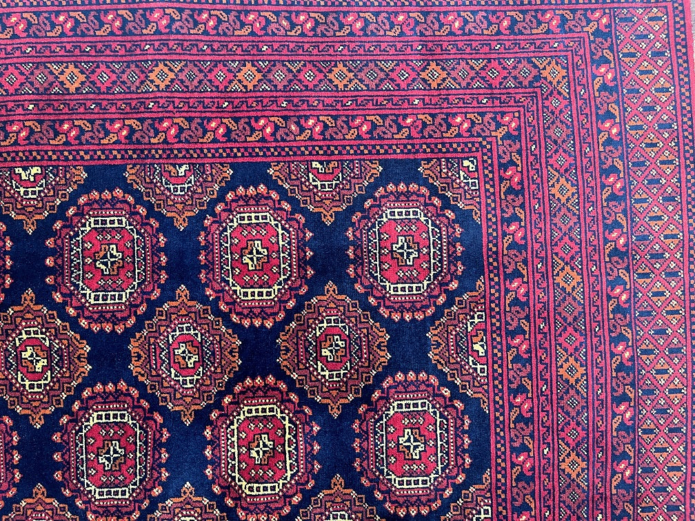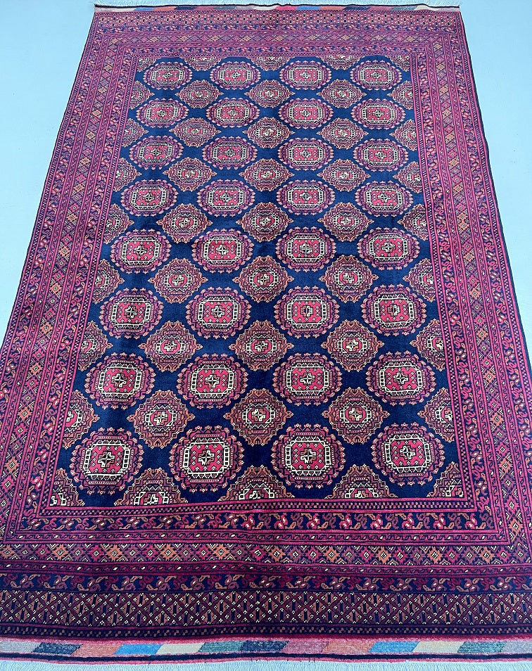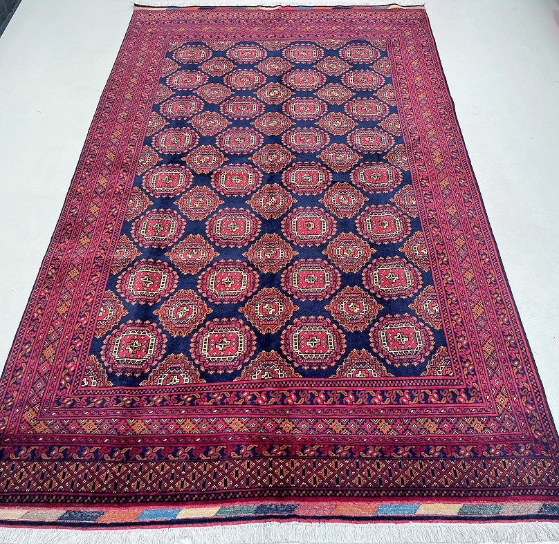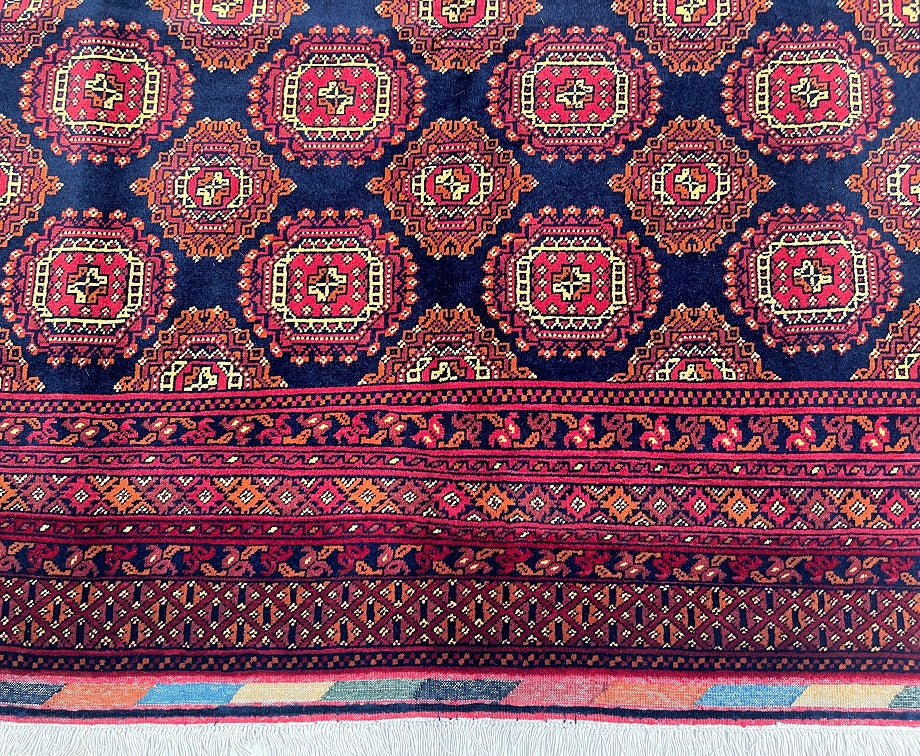 Superb Lamb’s Wool Authentic Hand Knotted Afghan Khamyab Rug. Deep Navy Blue With Ruby Red, Ivory, Terracotta And Subtle Golden Accents Dyed Using Traditional Methods. Last Of True Woven Nomadic Art.