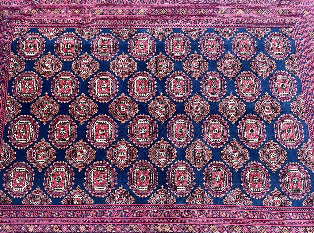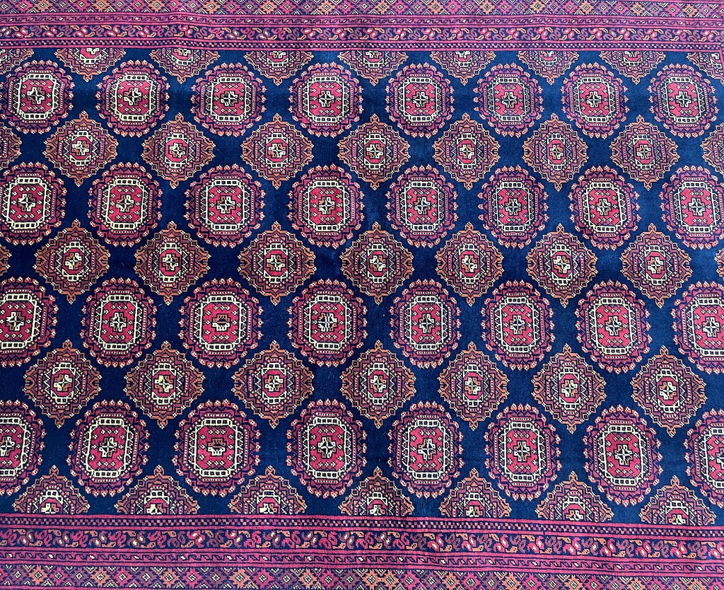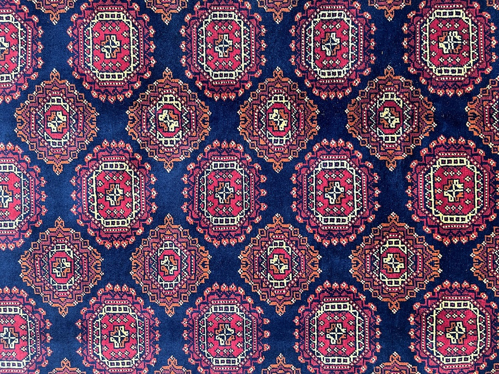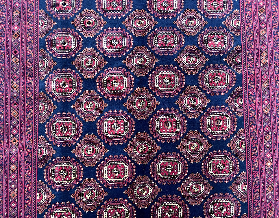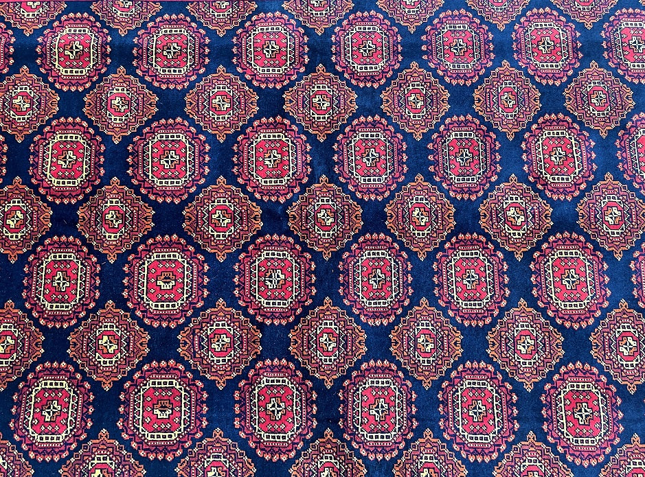 Traditional Bokhara Design Featuring Repeating Octagonal Gul Medallions, Often Referred To As The “Camel Foot” Pattern, Arranged In Rows Across The Field.