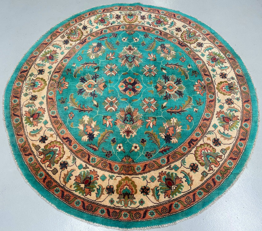 Room Size Hand Knotted Afghan Chobi Round Rug. Above All It Is Hard To Weave Circular carpets. Pure Lamb’s Wool Pile On Cotton Base. Turquoise, Beige, Green, Peach And Red Tone Dyed Using Traditional Methods (Vegetable Dyes). Last Of True Woven Tribal Art.