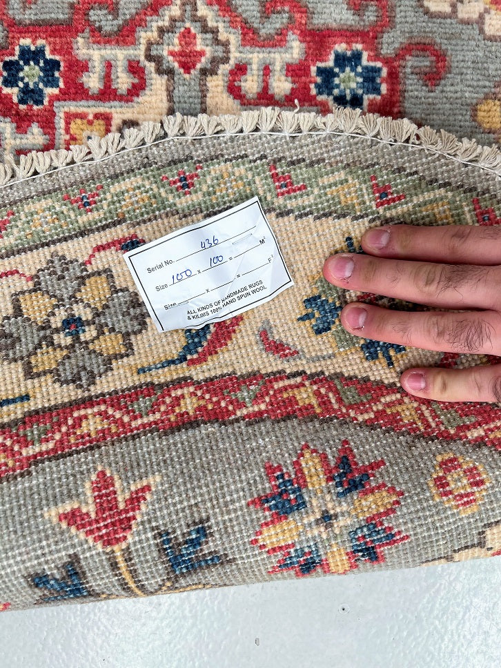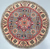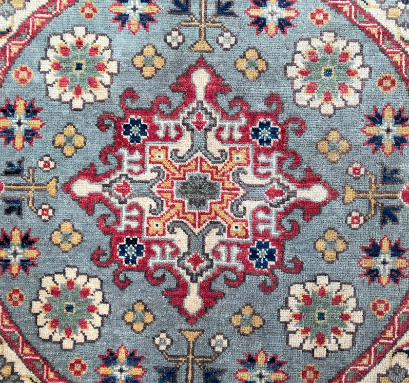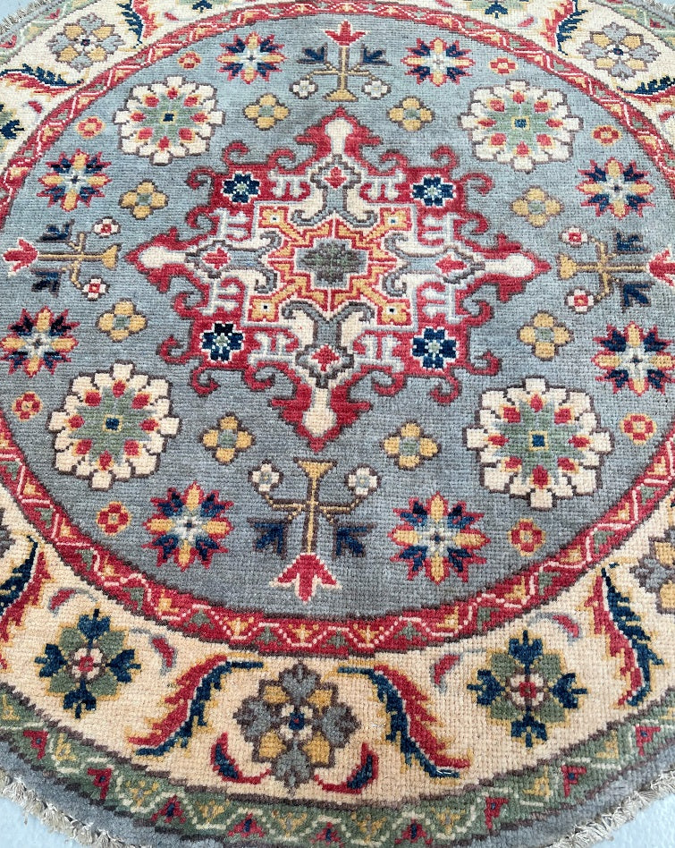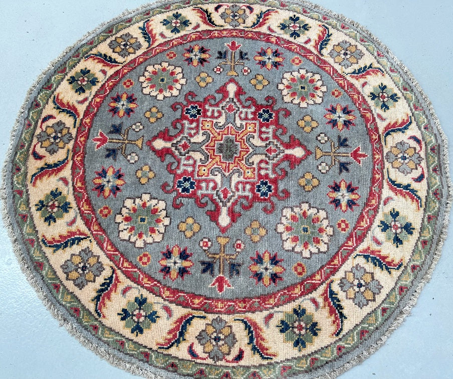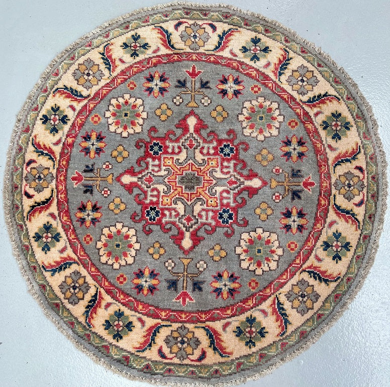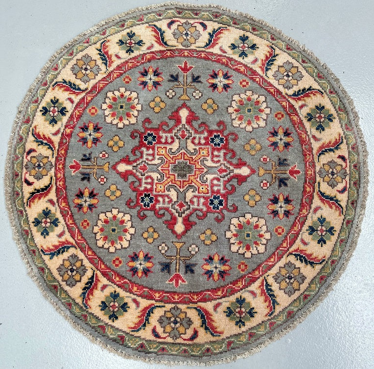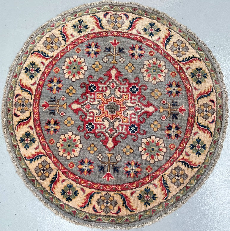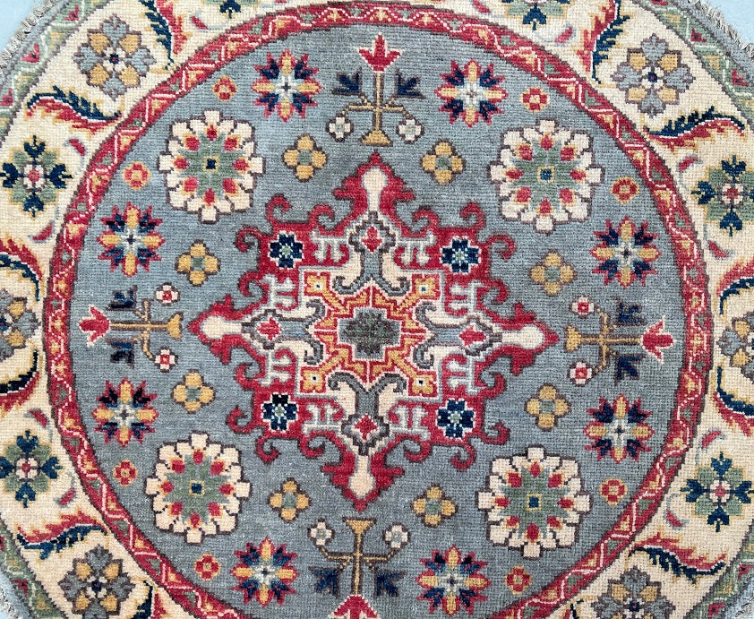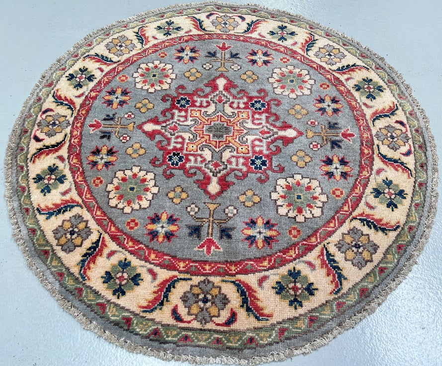 Coffee Table Size Authentic Hand-Knotted Afghan Kazak Round Rug, Crafted With A Pure Wool Pile On A Durable Cotton Foundation. This Beautiful Piece Features A Soft Stone Grey Field Surrounded By An Elegant Ivory And Beige Border, Creating A Balanced And Timeless Look.