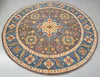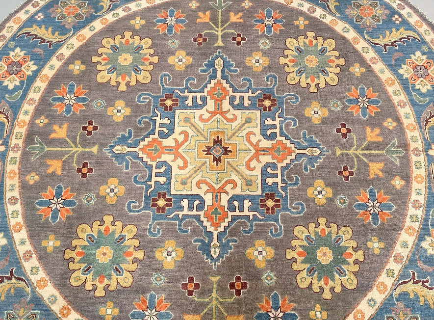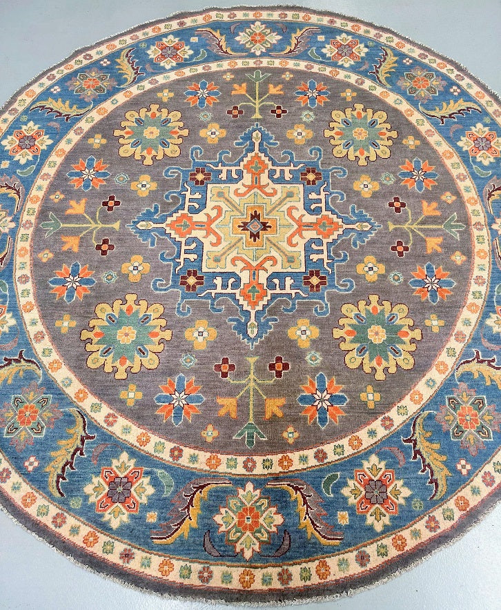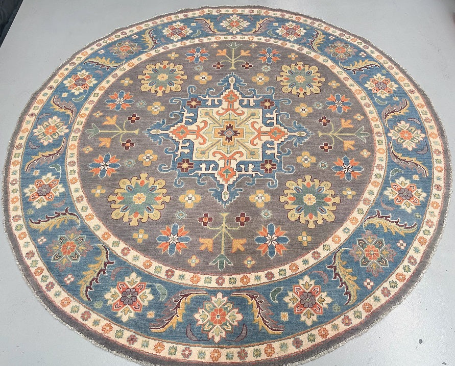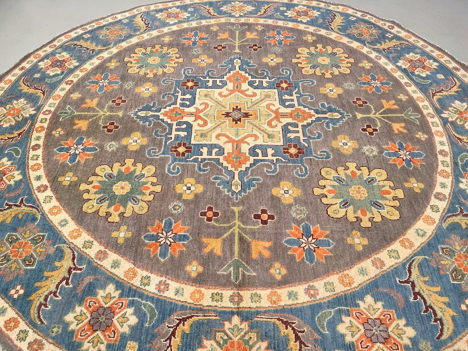 Rare Full Room Size Genuine Hand Knotted Afghan Kazak Round Rug. Above All It Is Ideal For A Round Or Square Dinning Table. It Also Has A Pure Hand Spun Wool Pile On Cotton Base. Light Brown, Beige, Green, Blue, Chocolate Brown And Orange Tone Dyed Using Traditional Methods (Vegetable Dyes). Last Of True Woven Tribal Art.