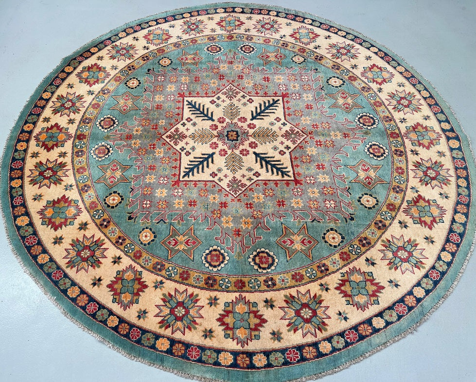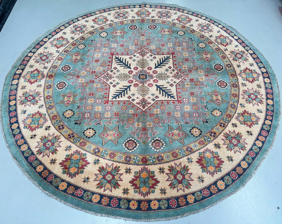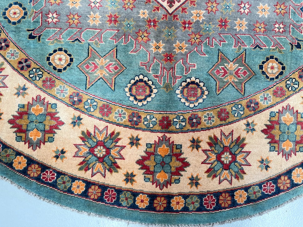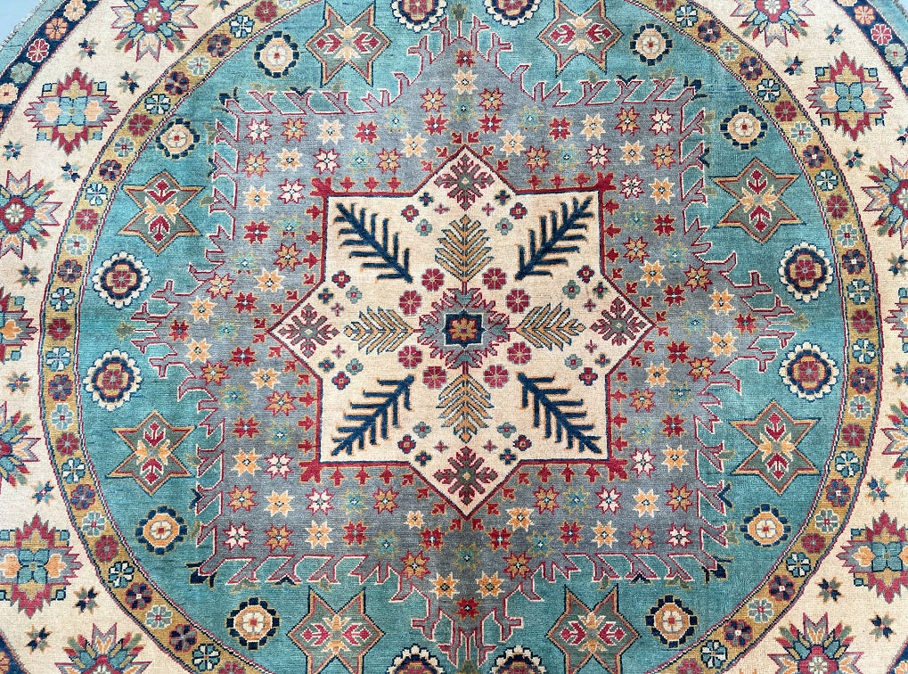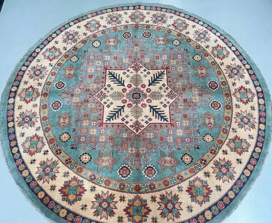 Decorative Full Room Size Genuine Hand Knotted Afghan Kazak Round Rug. Above All It Is Ideal For A Round Or Square Dinning Table. It Is Also Hard To Weave Circular carpets. Pure Wool Pile On Cotton Base. Aqua Marine, Grey Blue, Red, Beige, Gold, And Orange Tone Dyed Using Traditional Methods (Vegetable Dyes). Last Of True Woven Tribal Art.