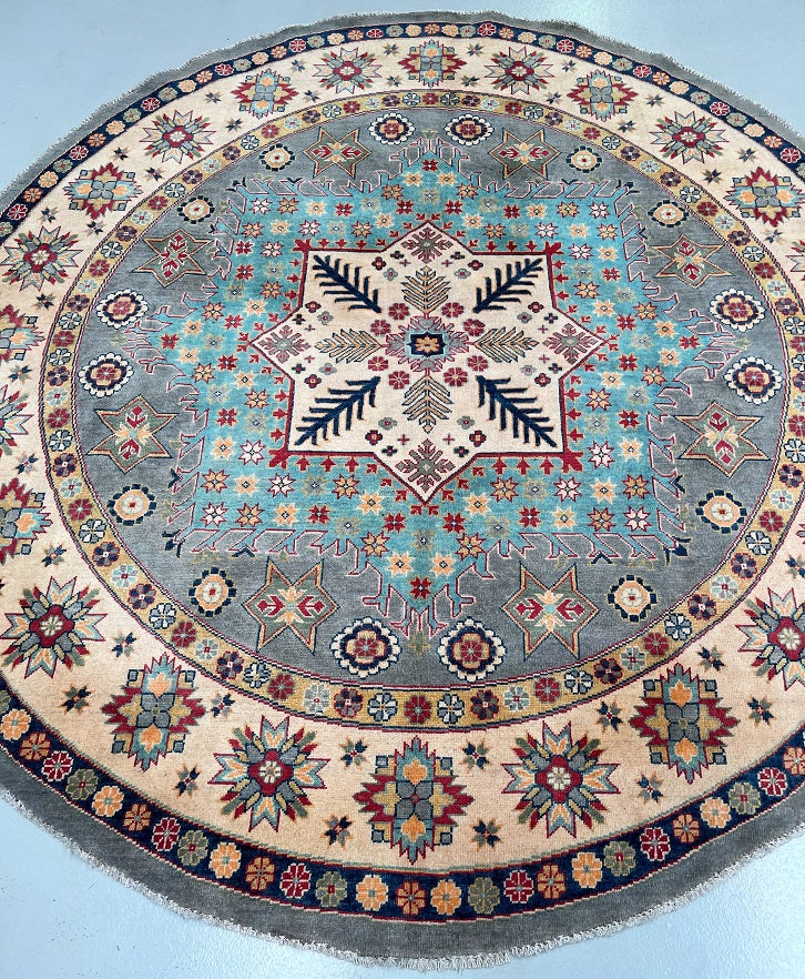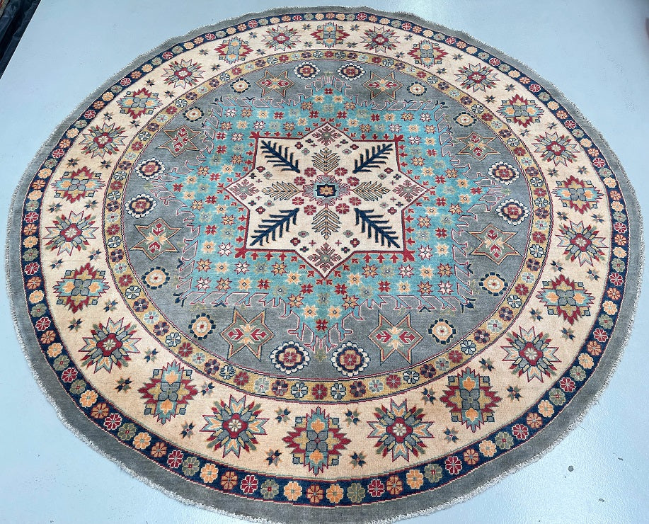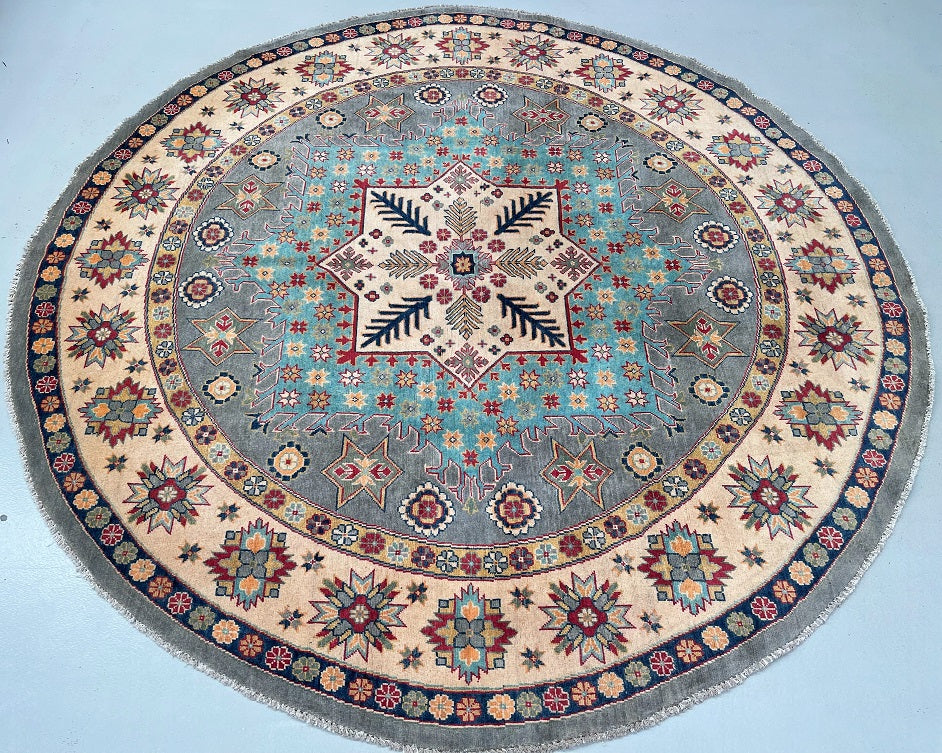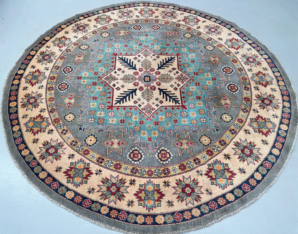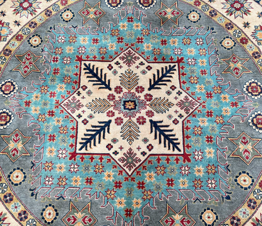 This full room-size pure wool hand-knotted Afghan Kazak rug features a beautifully balanced circular design with a soft sky-blue centre set against a refined stone-grey field. The ivory outer border is richly decorated with classic Kazak star motifs in deep red, navy, muted gold and soft teal, creating a vibrant yet harmonious colour palette.