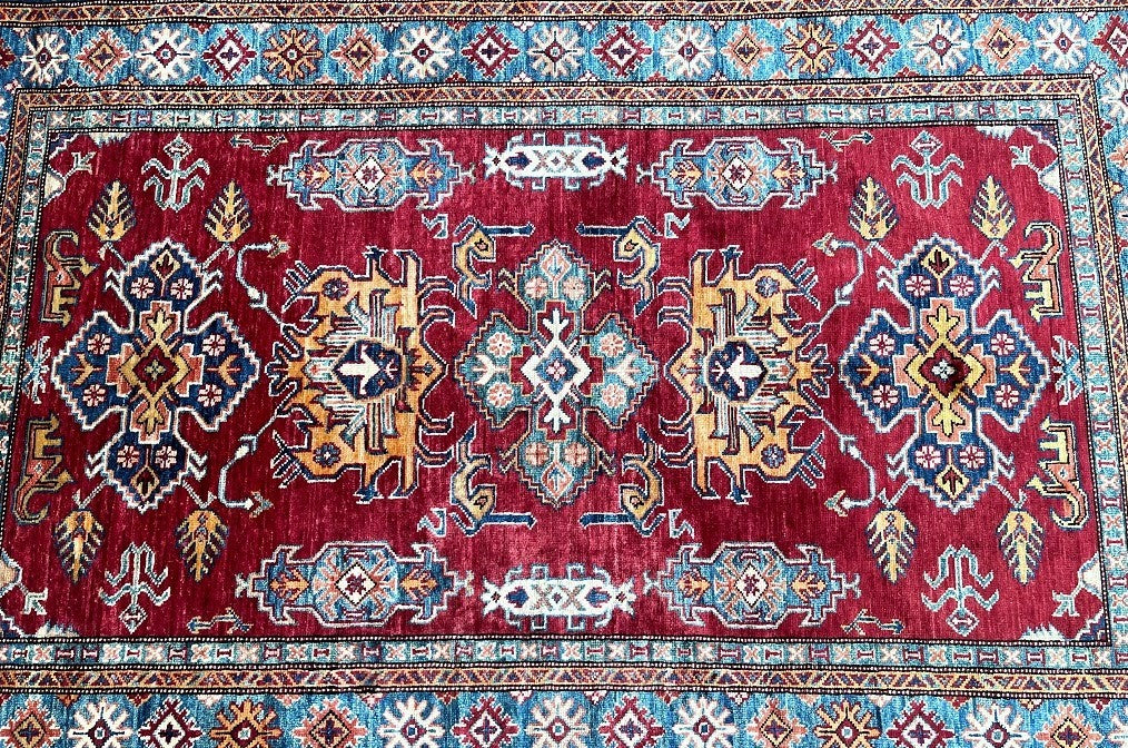 Gorgeous Coffee Table Size Authentic Hand Knotted Afghan Super Kazak Rug. Above All It Is Pure Hand Spun Ghazni Wool Pile On Cotton Base. Red, Blue, Beige, Orange, Green And Gold Tone Dyed Using Traditional Methods (Vegetable Dyes). Last of True Woven Nomadic Art.