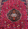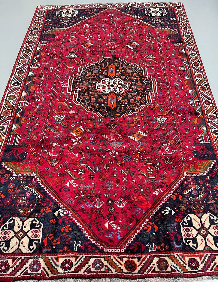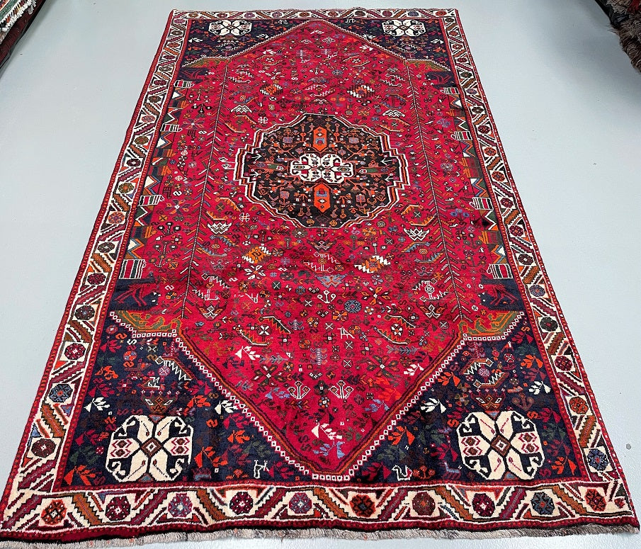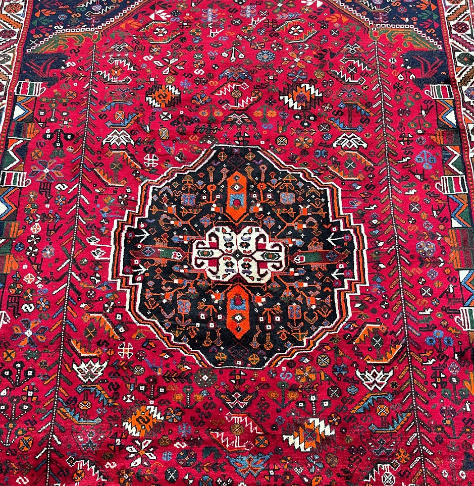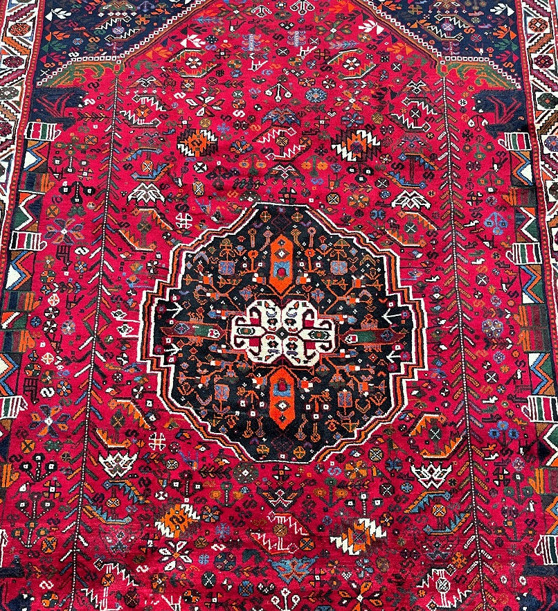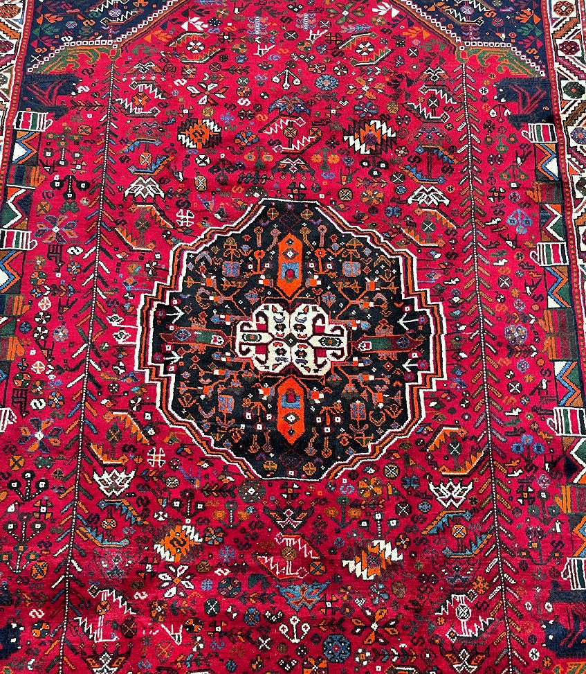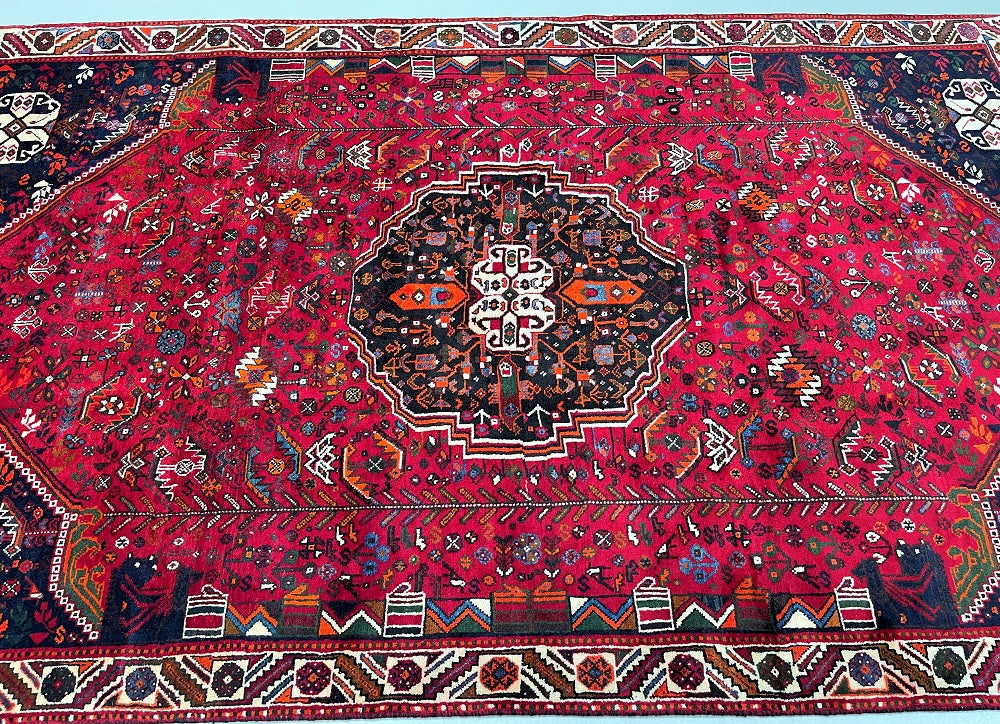 Persian Qashqai Shiraz Rug with Spacious Dimensions. Crafted with a Luxurious Hand Spun Wool Pile on a Wool Base, this rug showcases a vibrant color palette including shades of Red, Beige, Blue, Green, Yellow, Orange, and Black. The traditional dyeing techniques employed in its creation lend a timeless appeal. Adorned with a captivating Central Medallion Semi Geometric, Semi Floral Persepolis Design, this rug reflects the skilled craftsmanship of a weaver who dedicated approximately 9 months to complete it. Originating from the Shiraz District in South Persia, this handcrafted rug measures 285 x 175 cm and holds a gallery replacement value of $6900.