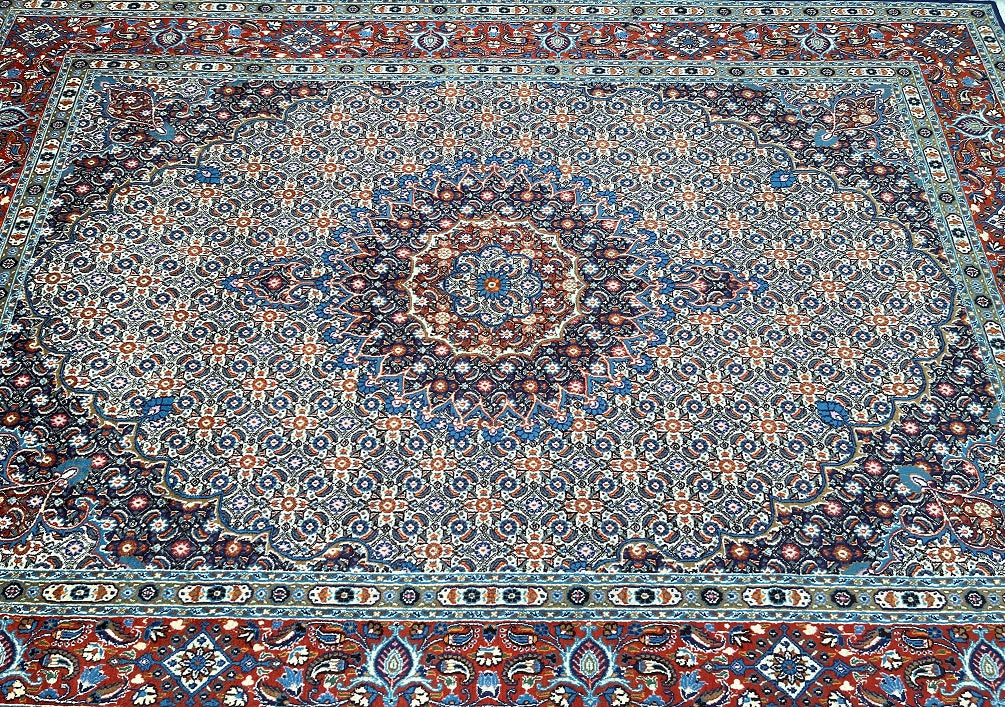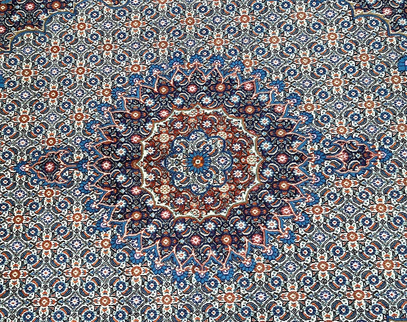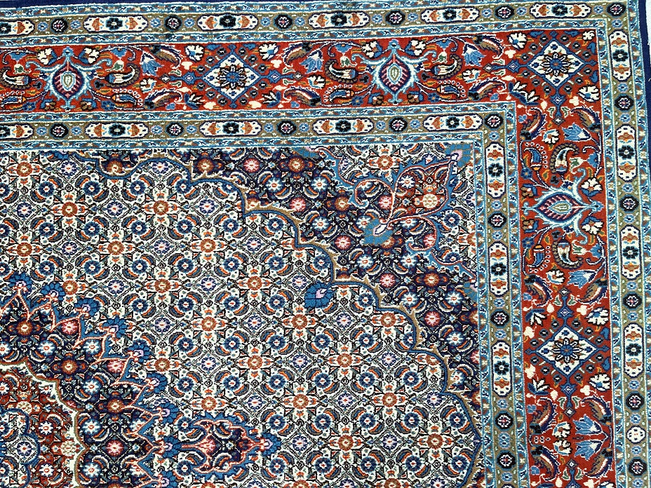 Full Room Size Hand Genuine Hand Knotted Persian Birjand Rug. Above All It Is A Timeless Pattern Which Is Very Decorative. It Is Also Hard To Find This Quality Original Handmade From This Region. It Has a Pure Lamb’s Wool Pile On Fine Cotton Base. Beige, Light Blue, Orange, Indigo Blue and Red Tone Dyed Using Traditional Methods.