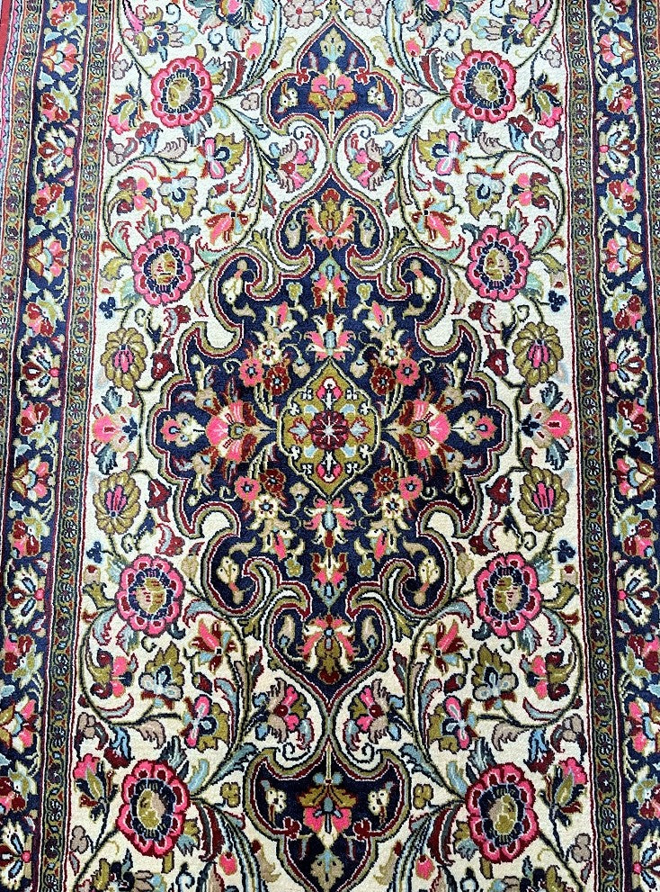 Superb Authentic Handmade Persian Qum Runner Rug. First Of All It Is A Versatile Size Which Could Be Used As As A Side Bed Rug Or A Short Runner. It Also Has A Lamb’s Wool Pile On Cotton Base. Beige, Blues, Pink And Olive Green Tone Dyed Using Traditional Methods.