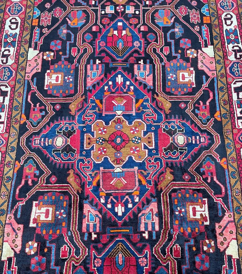 Gorgeous Room Size Genuine Hand Knotted Vintage Persian Tuserkan Rug. Above All It Is Hard To Find Type Handmade Tribal Pieces in Room Size Carpets. Hand Spun Wool Pile On Cotton Base. It Also Has A Deep Indigo Blue/Black, Beige, Red, Mustard, Orange, Pink And Brown Tone Dyed Using Traditional Methods.