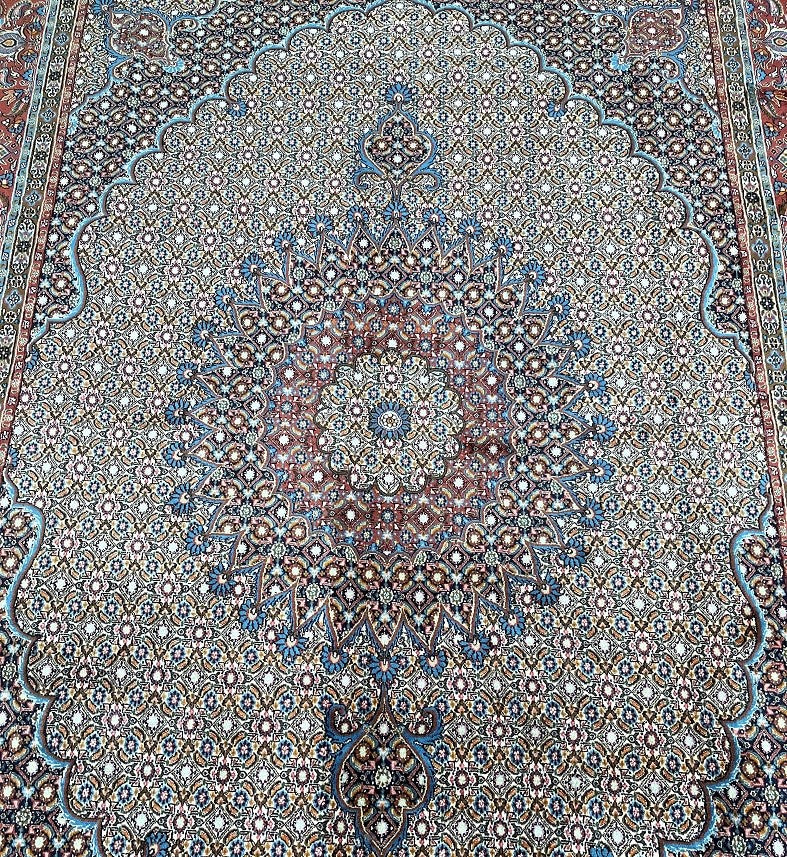 Superb Large Room Size Genuine Handmade Persian Birjand Mood Rug. Above All It Is Hard To Find This Quality Original Handmade In Larger Sizes. It Also Has A Lamb’s Wool And Silk inlaid Pile On Fine Cotton Base. Beige, Blue, Terracotta Red, Pink, Orange And Black Tone Dyed Using Traditional Methods.