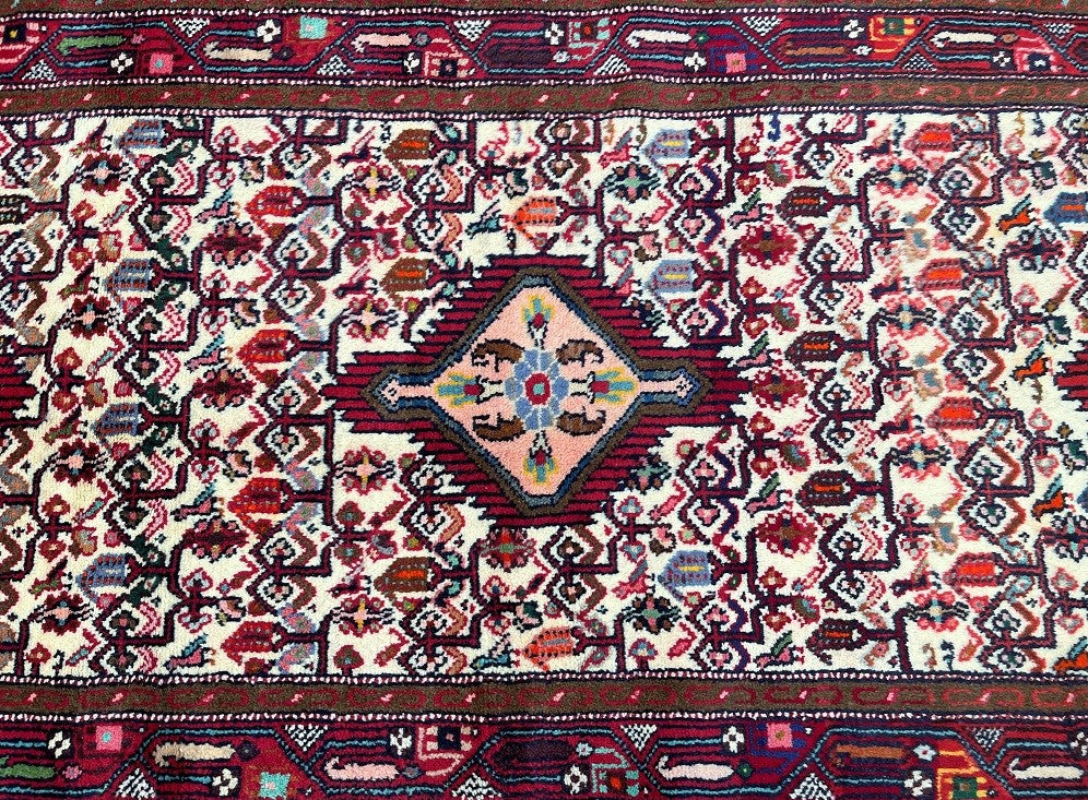Rare Authentic Tribal Handmade Persian Hamedan Hall Runner. Above All It Has A Pure Hand Spun Wool Pile On Cotton Base. It Also Has A Beige, Red, Blue, Green And Pink Tone Dyed Using Traditional Methods.