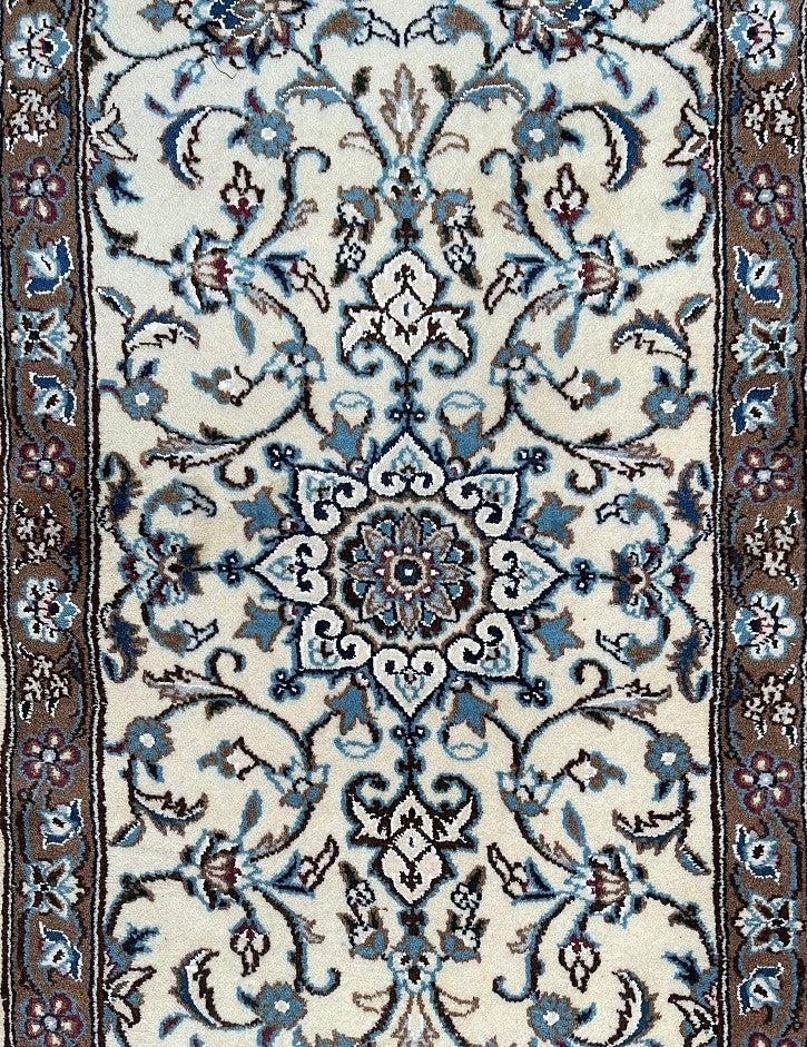 Superb Authentic Handmade Persian Nain Hall Runner. Above All It Is A Very Versatile Size And Could Be Used In Many Place In A House. Pure Wool Pile On Cotton Base. Beige, Blue, Brown And Black Tone Dyed Using Traditional Methods.