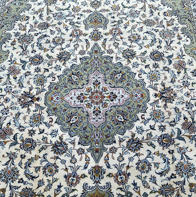 Large Room Size Authentic Handmade Vintage Persian Kashan Rug. Above All It Is Hard To Weave This Quality Hand Made Rug In Larger Sizes. This Rug Has A Pure Lamb’s Pile On Cotton Base. Beige, Green And Blue Tones Dyed Using Traditional Methods.