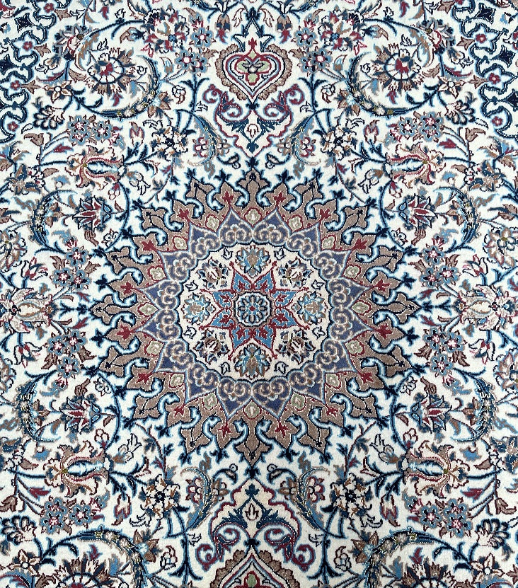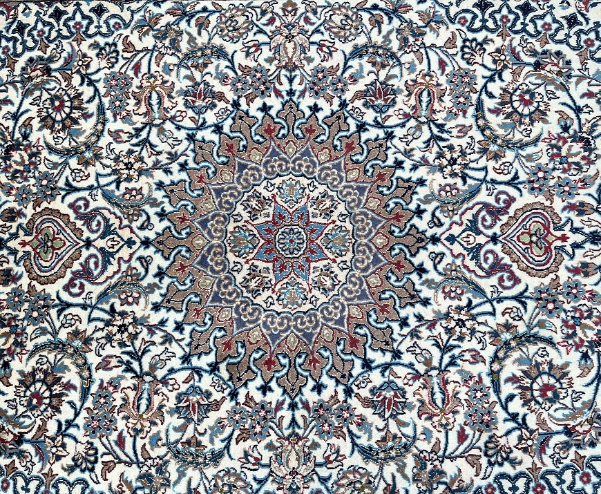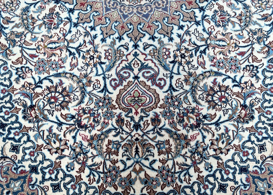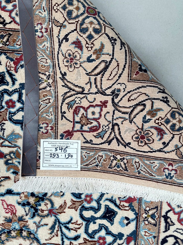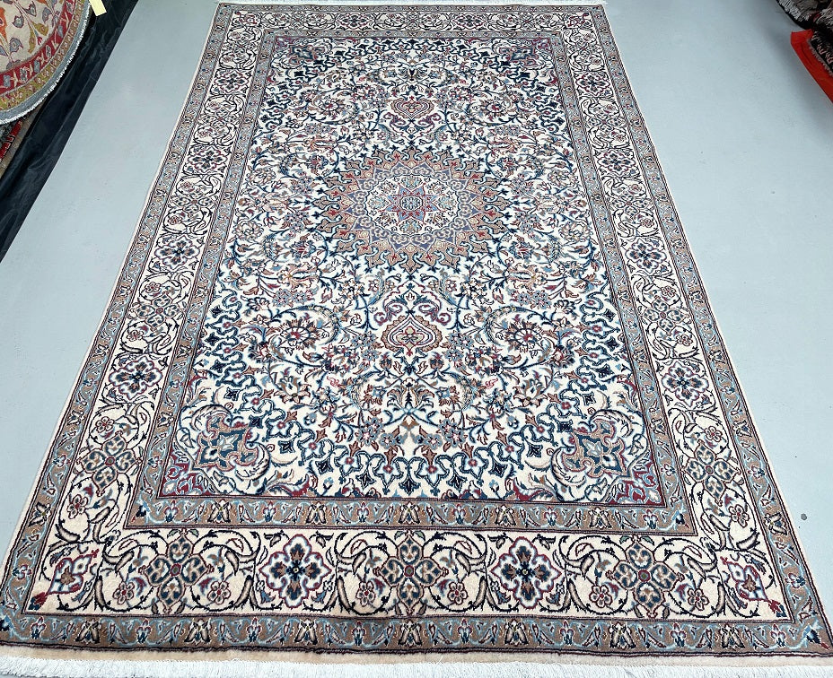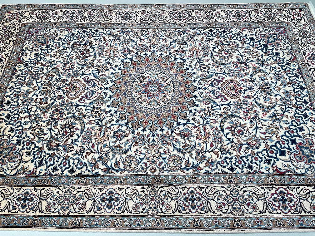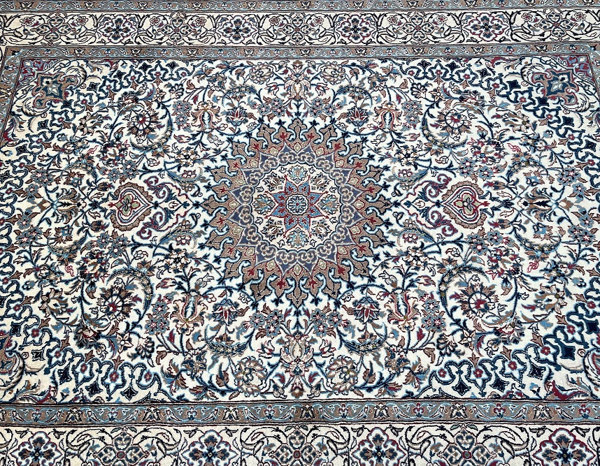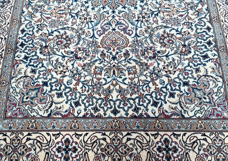 Full Room Size Authentic Hand Knotted Persian Nain Rug. Above All It Has A Lamb’s Wool With Touch Of Silk Pile Cotton Base. Sandy Beige And Blue Tone Dyed Using Traditional Methods. Fine Quality Rug Ideal for Every Day Usage.
