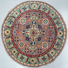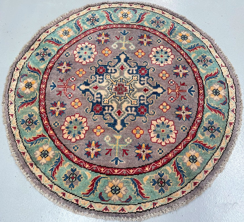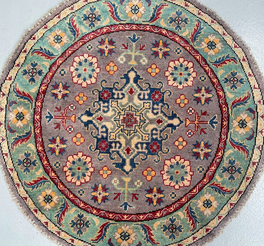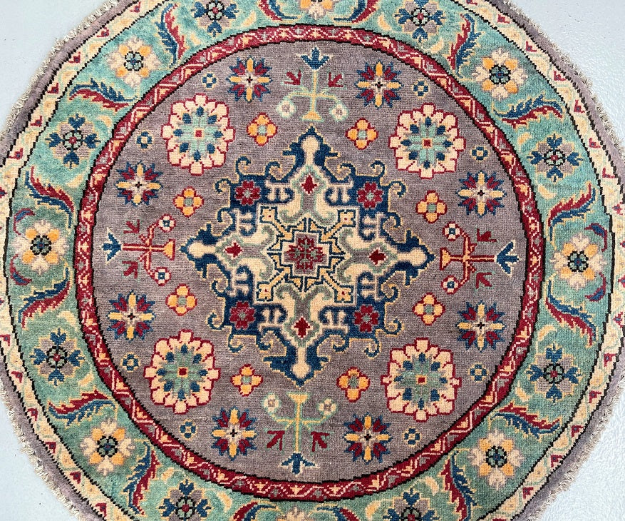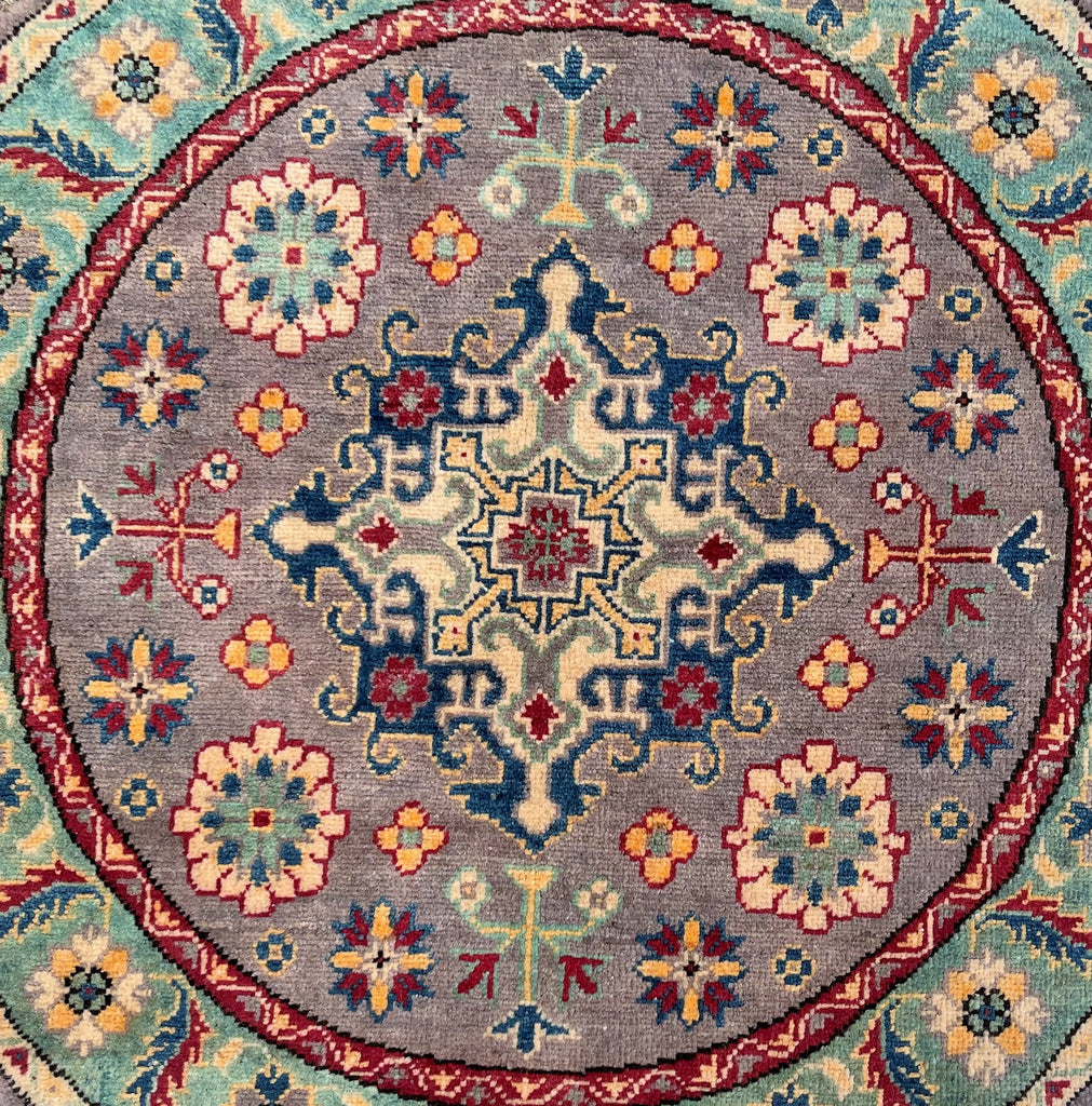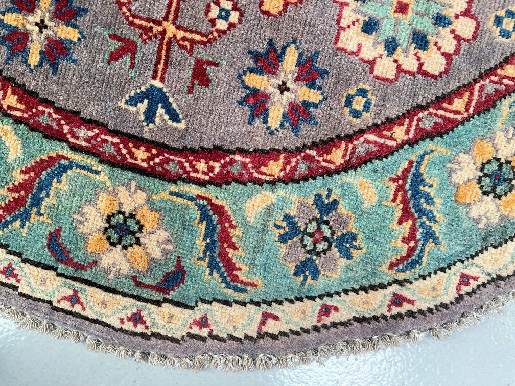 Coffee table Size authentic hand knotted Afghan Kazak round rug. It features a pure wool pile on a cotton base, ensuring its durability and quality. The main colours Soft dove grey, turquoise blue, ivory, warm gold, coral red and deep navy accents are achieved through traditional methods using vegetable dyes, adding an authentic touch to the rug. The semi geometric, semi floral design, renowned as the Caucasian pattern, further enhances its beauty. It is worth noting that it took a skilled weaver approximately 4 months to complete this intricate piece. Hand-woven in Afghanistan, this rug measures 100 x 100 cm and holds a gallery replacement value of $1399.