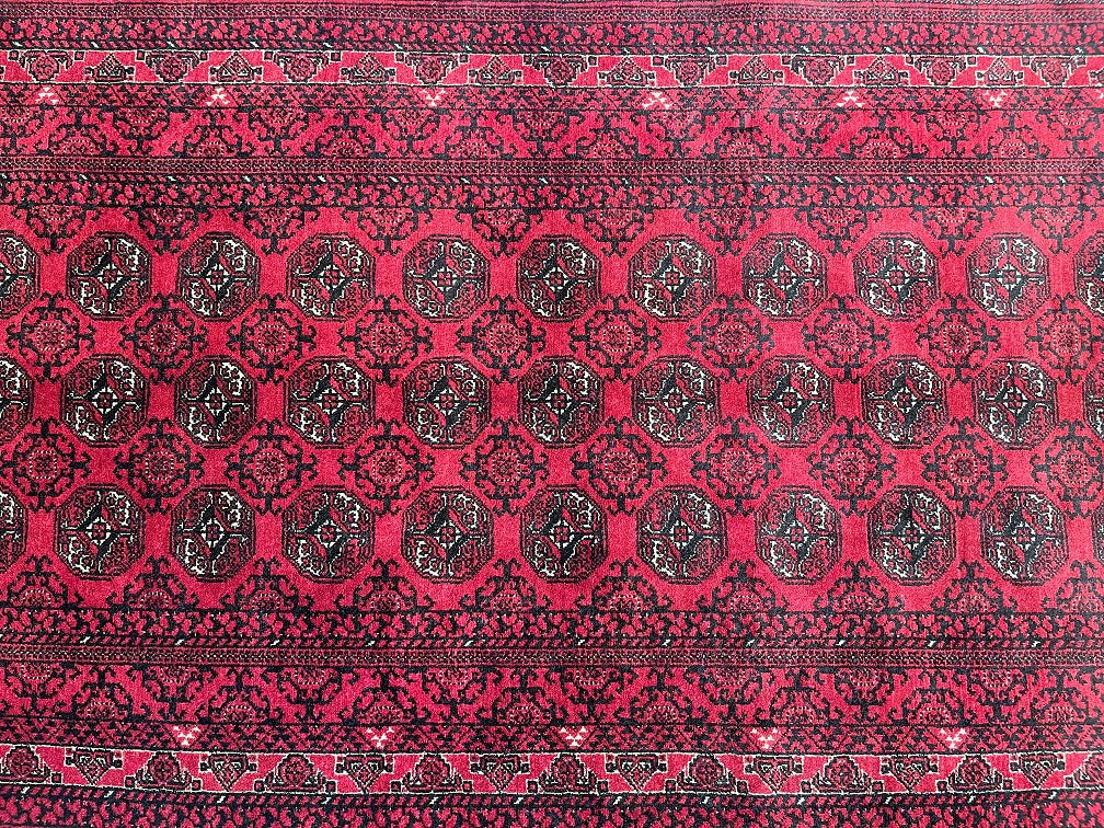 Authentic Hand Knotted Tribal Afghan Roshnai Rug Which Can Also Be Used As A Short Runner. It Has a Lamb’s Wool Pile On Cotton Base. Main Colors are Red, Black And Beige Tone Dyed Using Traditional Methods. This Runner Would Look Fantastic On Wooden Floor Board.