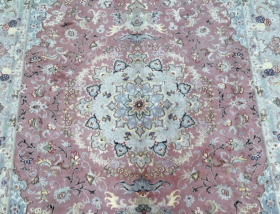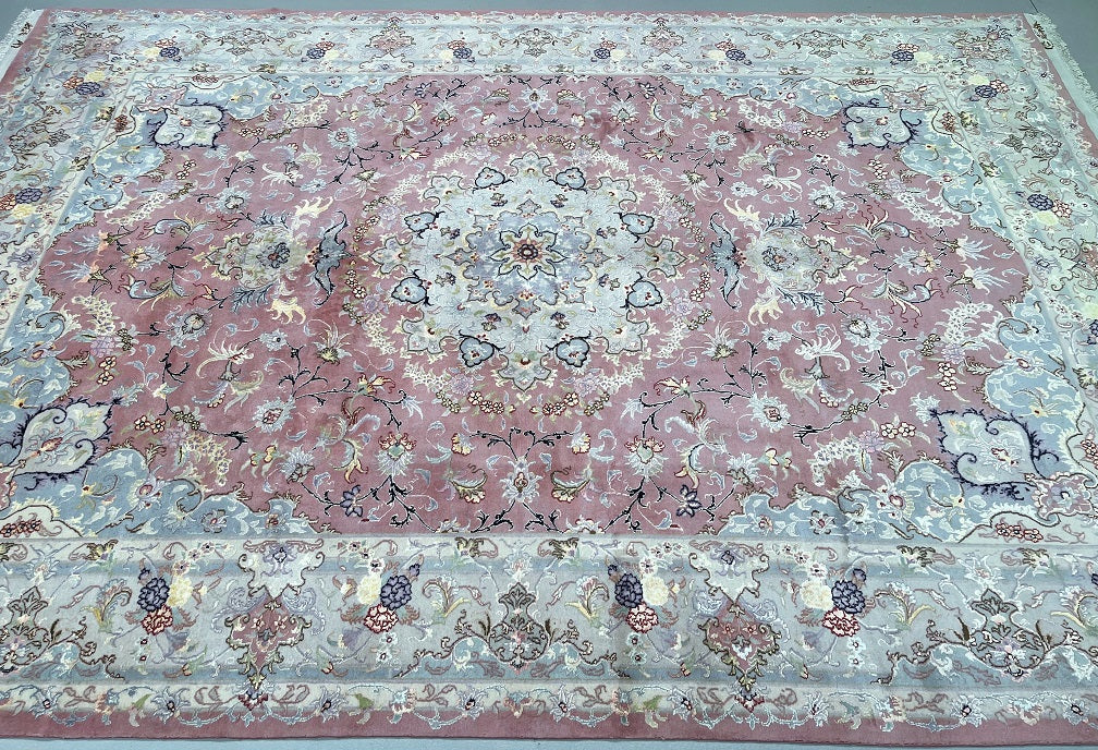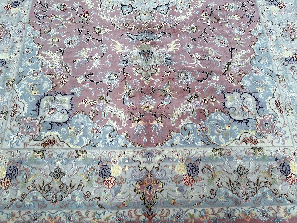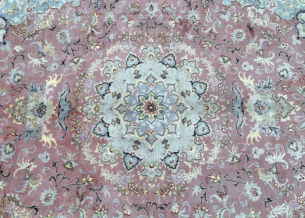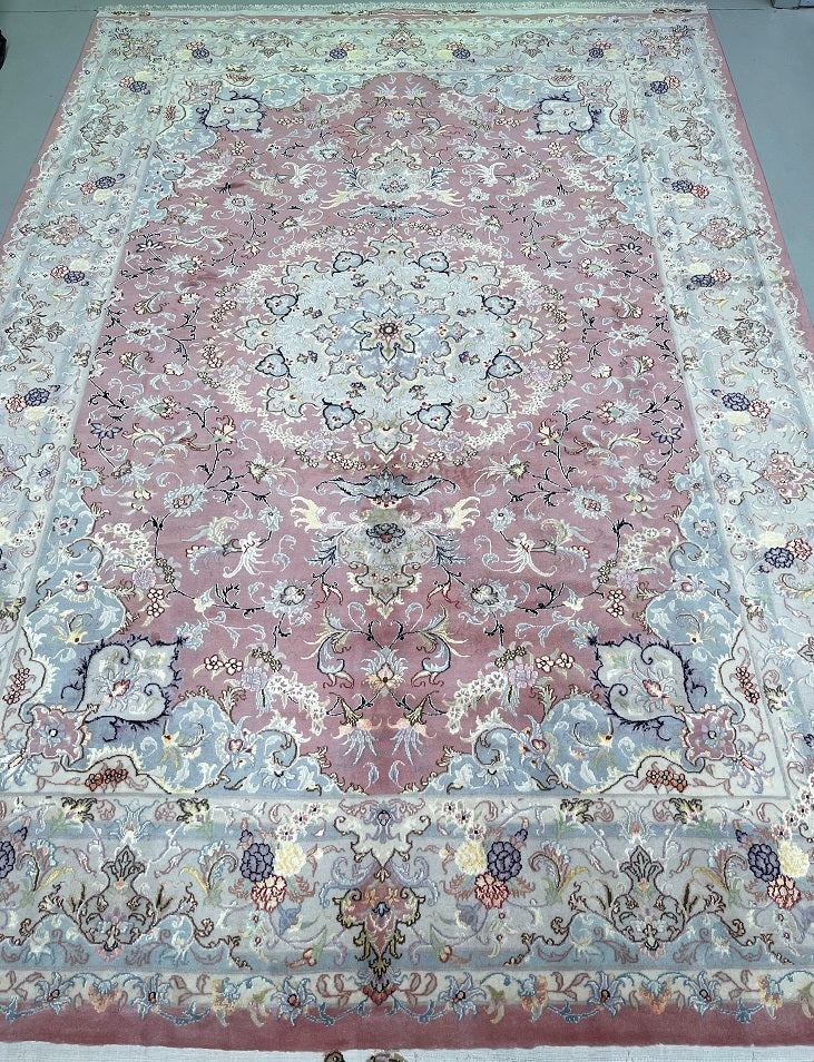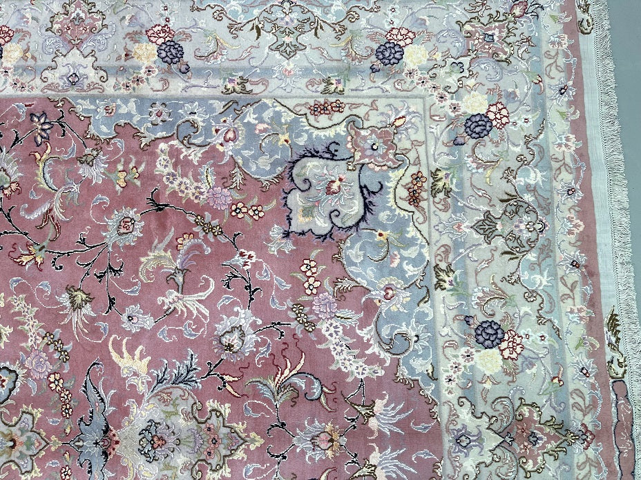 Large Room Size Authentic Handmade Persian Kashmar Carpet Signed From Weaving House Of “Alizadeh”. Above All It Has A Lamb’s Wool And Silk Pile On Silk Base. Pastel Pink Tone Dyed Using Traditional Methods.