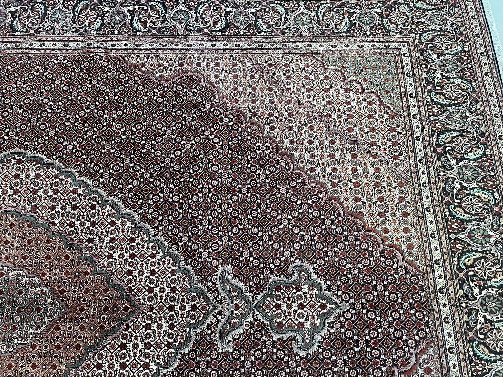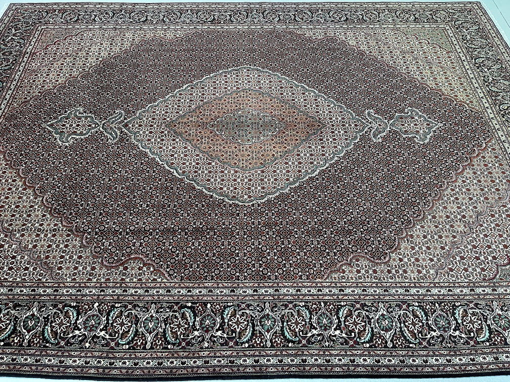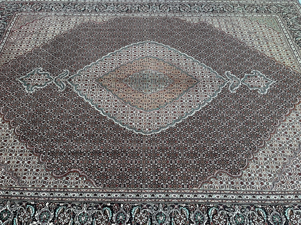 Superb Large Room Size Genuine Handmade Mahi Persian Tabriz Rug. Above All It Has A Lamb’s Wool With Touch Of Silk Pile on Cotton Base. It Also Has A Black, Beige, Green, Brown, Blue And Gold Tone Dyed Using Traditional Methods. Pin Point Quality From Famous City Of Tabriz.