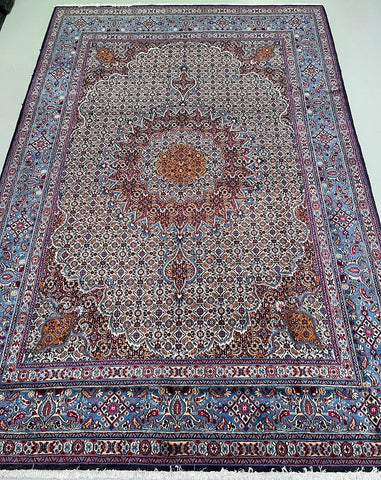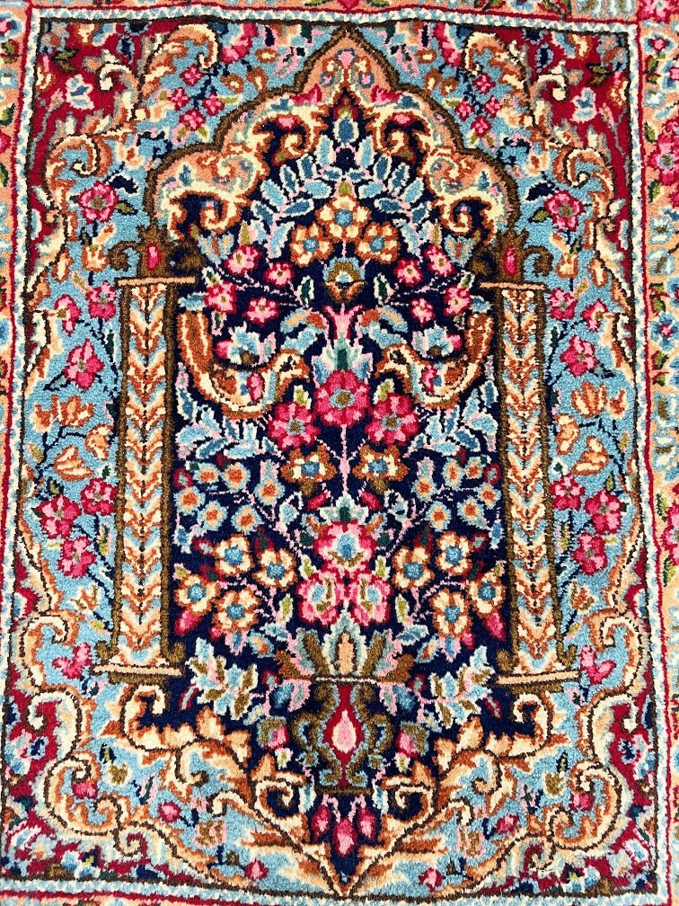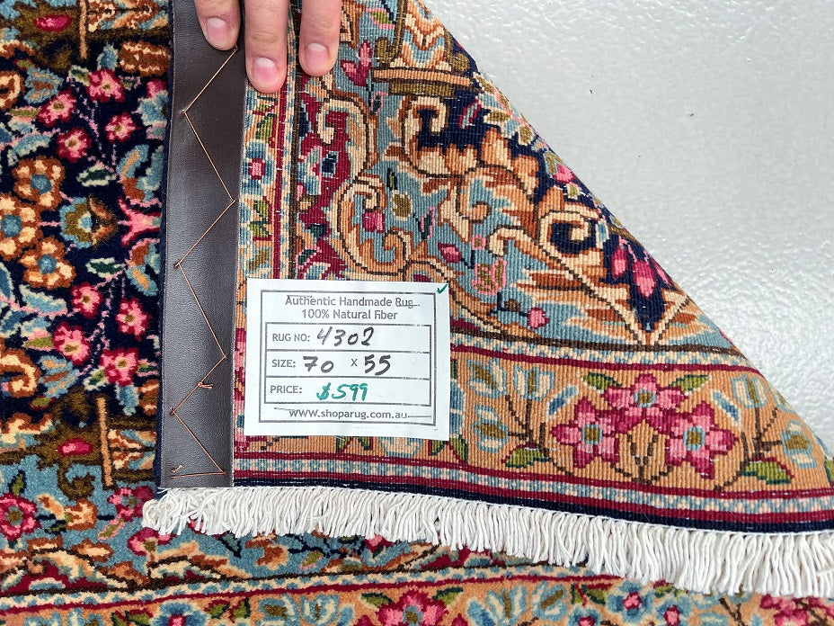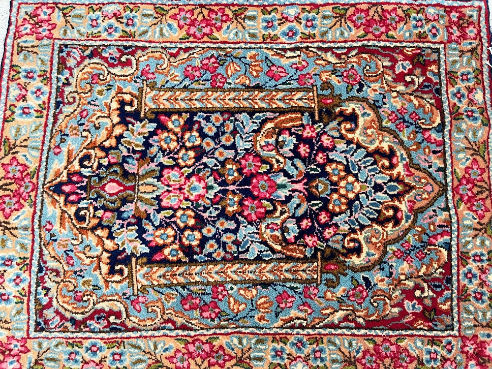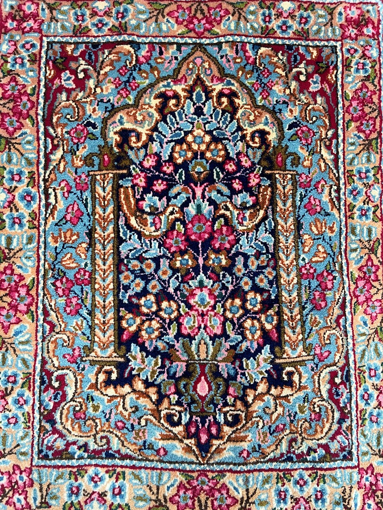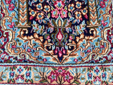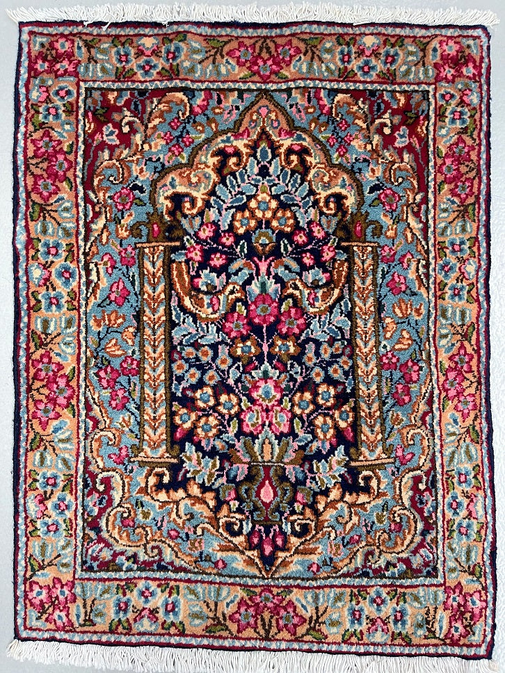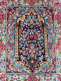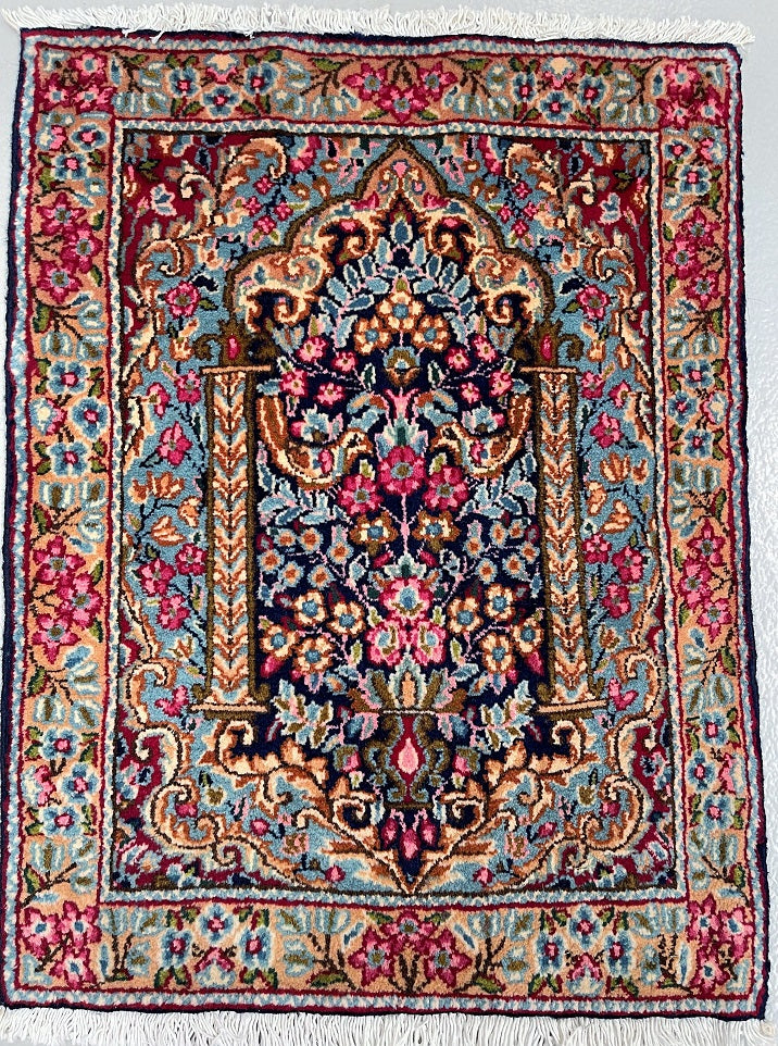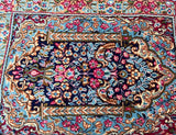 Fine Authentic Handmade Persian Kerman Rug. Above All We Do Have This Rug In A Matching Pair. It also Has A Pure Lamb’s Wool Pile on Cotton Base. Indigo Blue, Beige, green, Pink And Red Tone Dyed Using Traditional Methods.